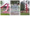 The collage shows some of the adult equipment. There is a slide, a rocking...