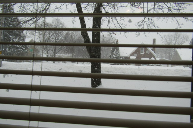 The picture is this morning with the blinds down instead of up. We're getting another 10 inches or more of snow today. Thanks for reading.
