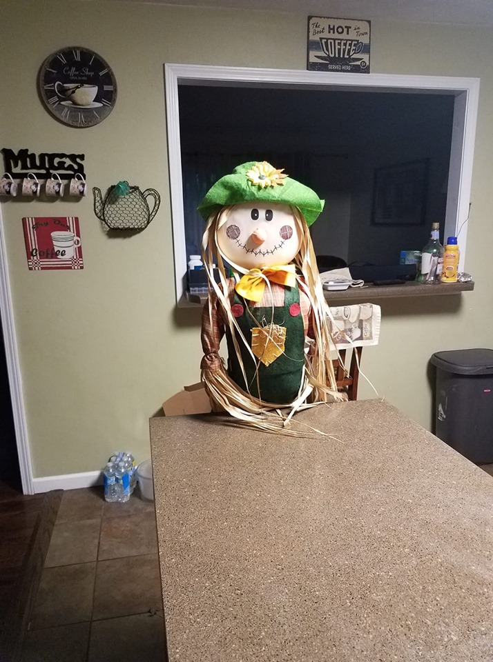 She left. I finally went to the back bedroom and got busy brushing my teeth and getting ready for work. When I walked into the kitchen I gave myself a fright when I saw the scarecrow propped against the center island.