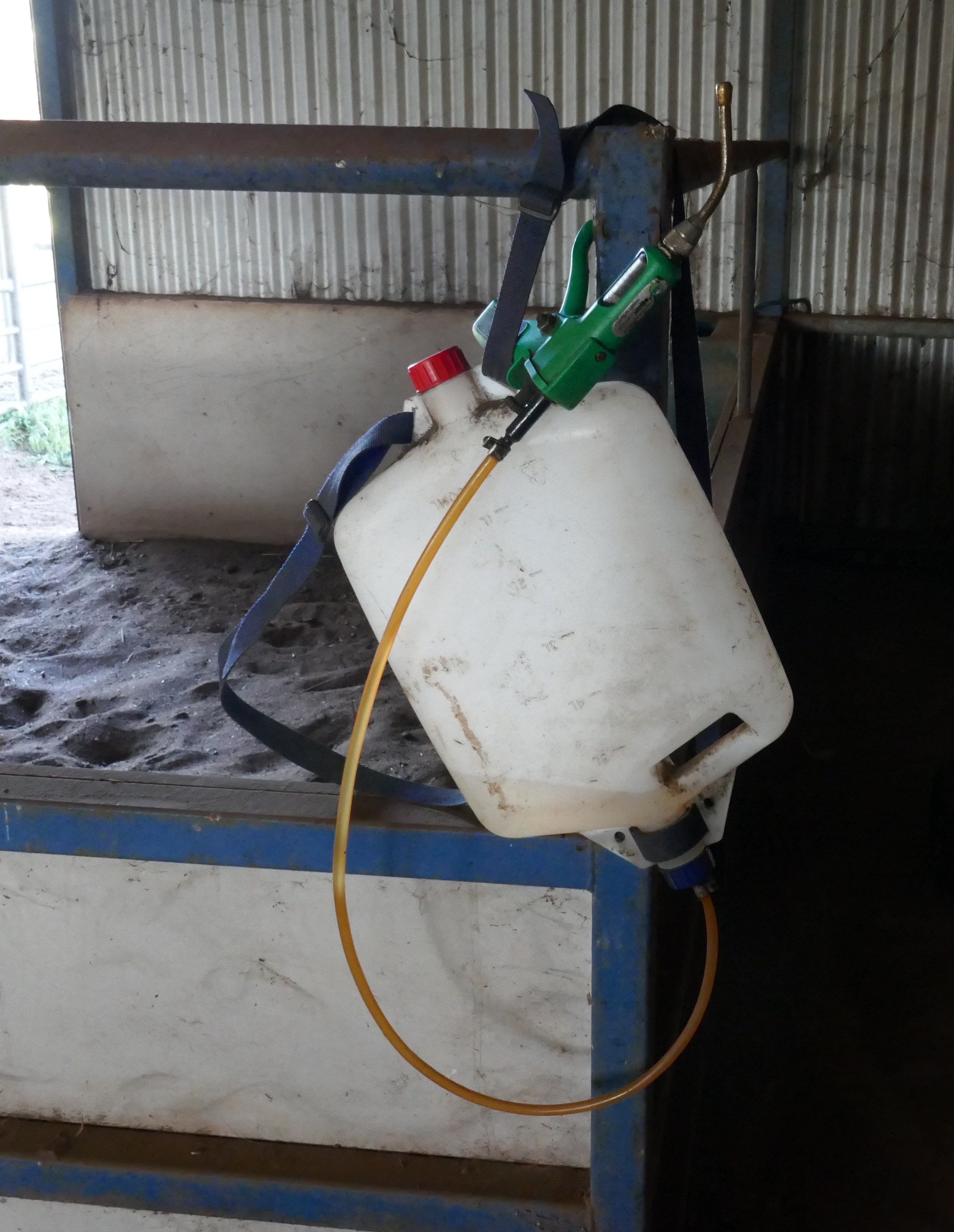 One of the horses here has a dental problem and each morning, I use a ‘gun’ to squirt something into each side of its mouth. The photo shows the bag containing the solution with a tube that runs the solution to the gun. This apparatus is more commonly used for drenching sheep.