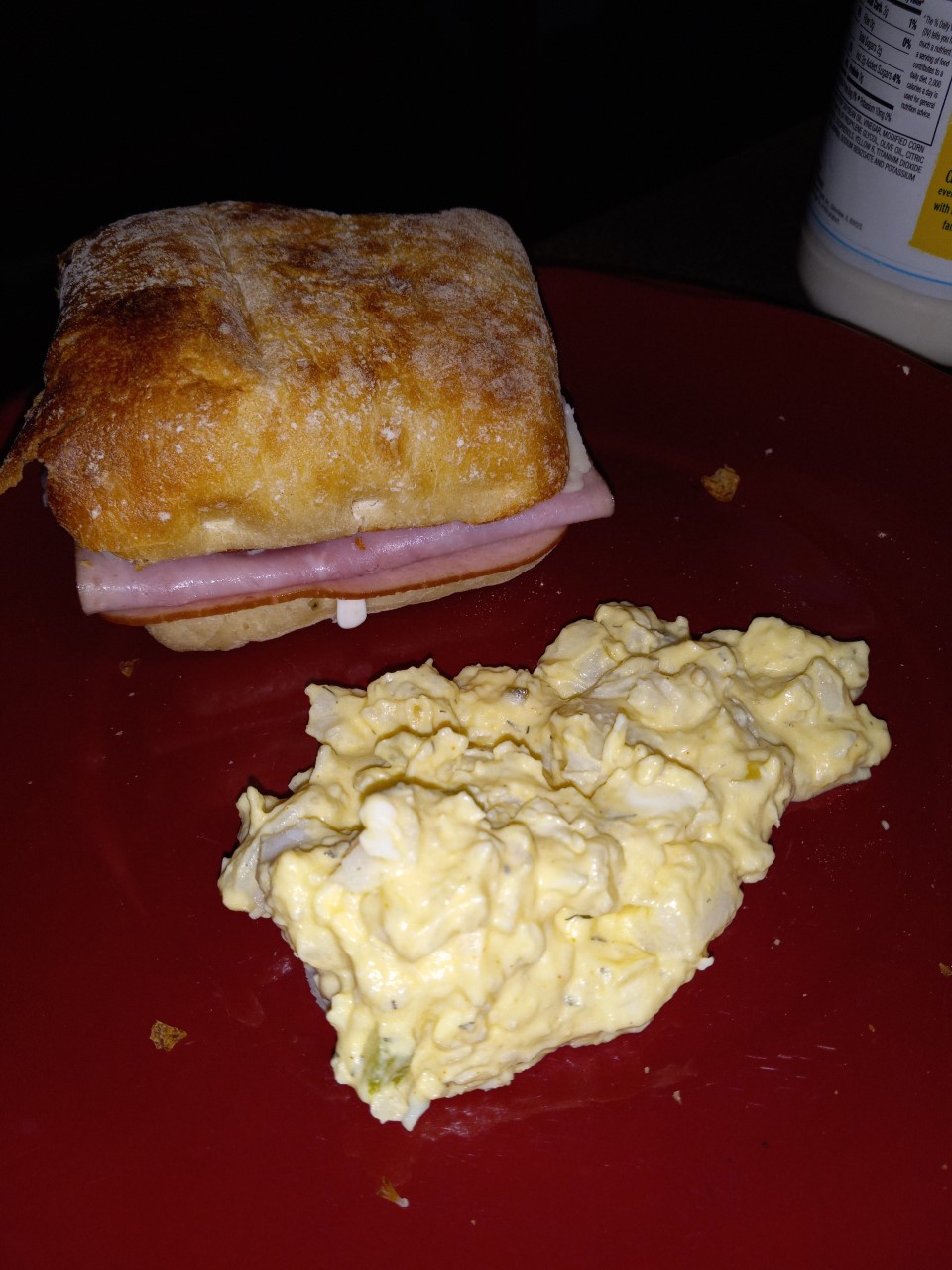 A ham sandwich on a toasted ciabatta bun with Miracle Whip, onions and tomato. On the side we still had some deviled egg potato salad left over, so we finished that up.