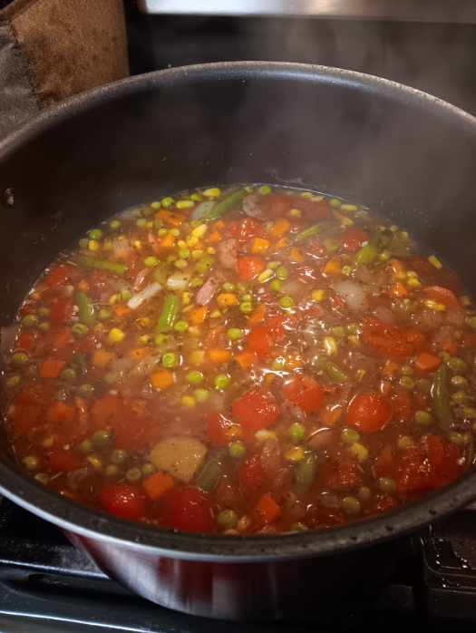 I added the liquid into the soup and added 3 beef bullion cubes, 3 tablespoons of minced garlic, oregano, and Italian seasoning. Then I added in 2 cups of mixed veggies and I will let that cook for about an hour or just a little over.