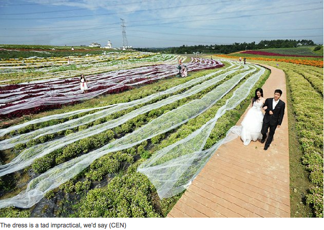 This Chinese bride has her wedding dress with a train that runs into 3 miles long creating Guiness Book of World Records