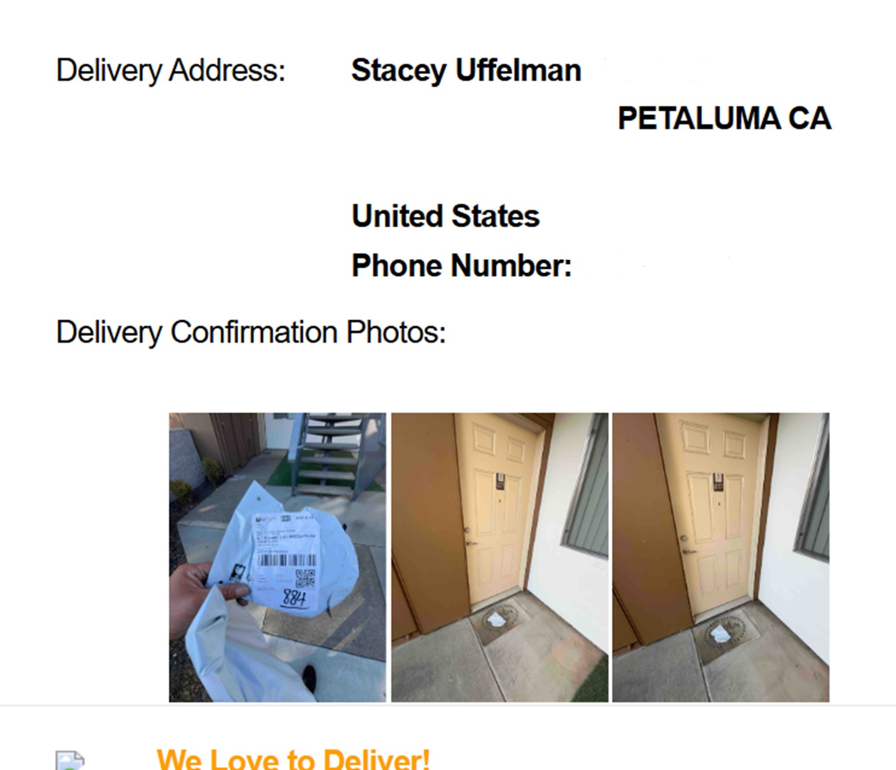 When I got on line and looked at my email, I saw a message saying something had been delivered with a few photos of the package outside my door (see above).