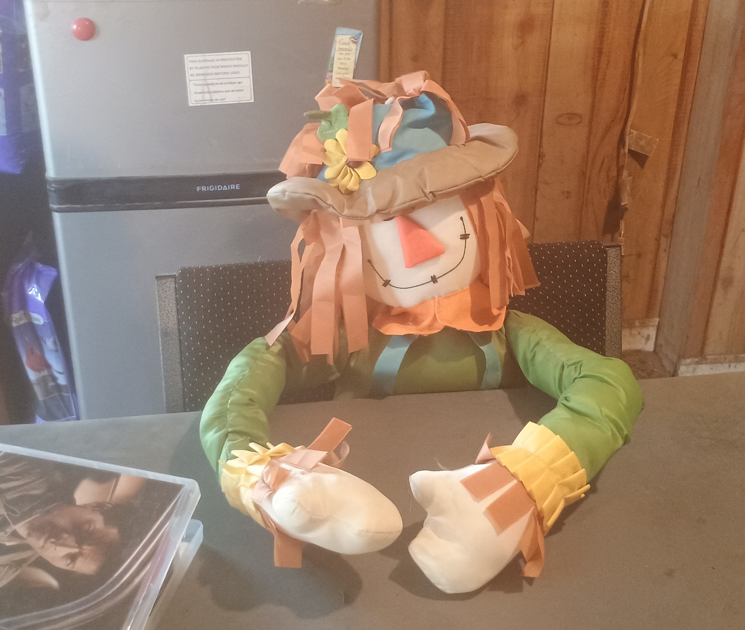 He's cute. I used to have a cute scarecrow, but his hat wouldn't stay on. He was old so I threw him away.