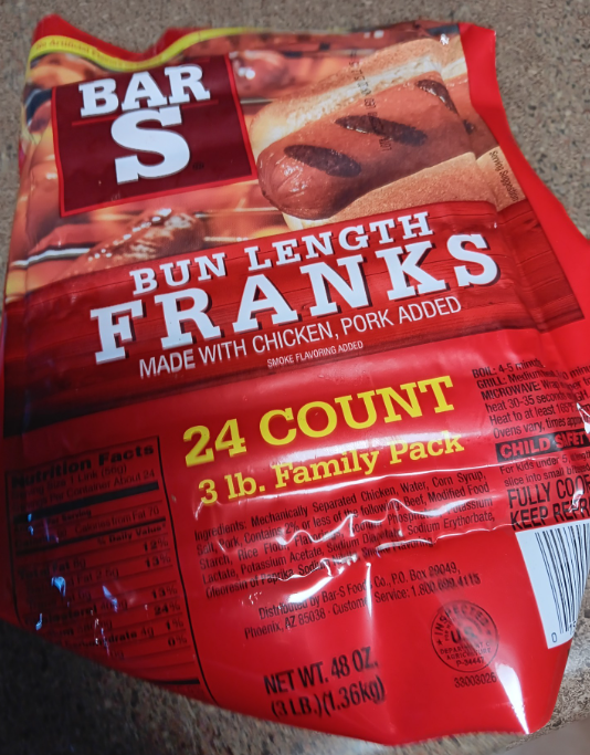 I like to buy the Bar-S 3-pound family pack, which has 24 hot dogs, and we keep 8 up, and freeze the other 16 in two packs of 8.
