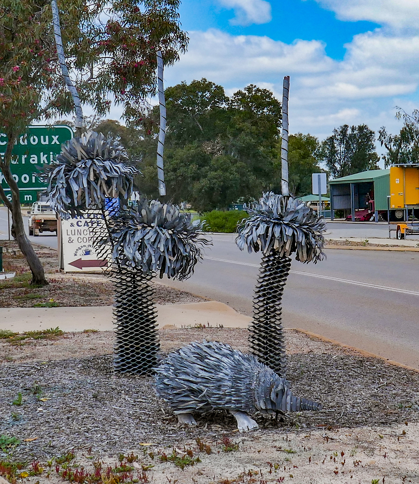 There must be someone in the Wongan Hills area who is clever with creating things from corrugated iron. I’ve put up a kangaroo family a year or two ago and recently an emu family and an elegant lady. This time we have a very realistic grass-tree and an echidna.