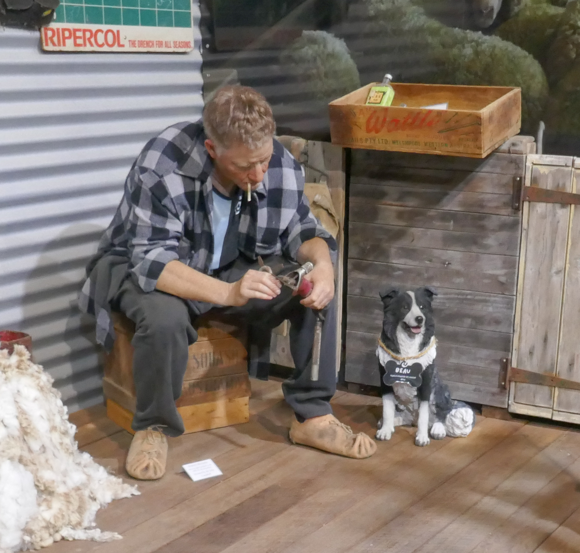 The wax model of a shearer was very authentic. Look at the way the cigarette hangs from his lip. He is busy cleaning his handpiece which Beau, his border collie, keeps him company.