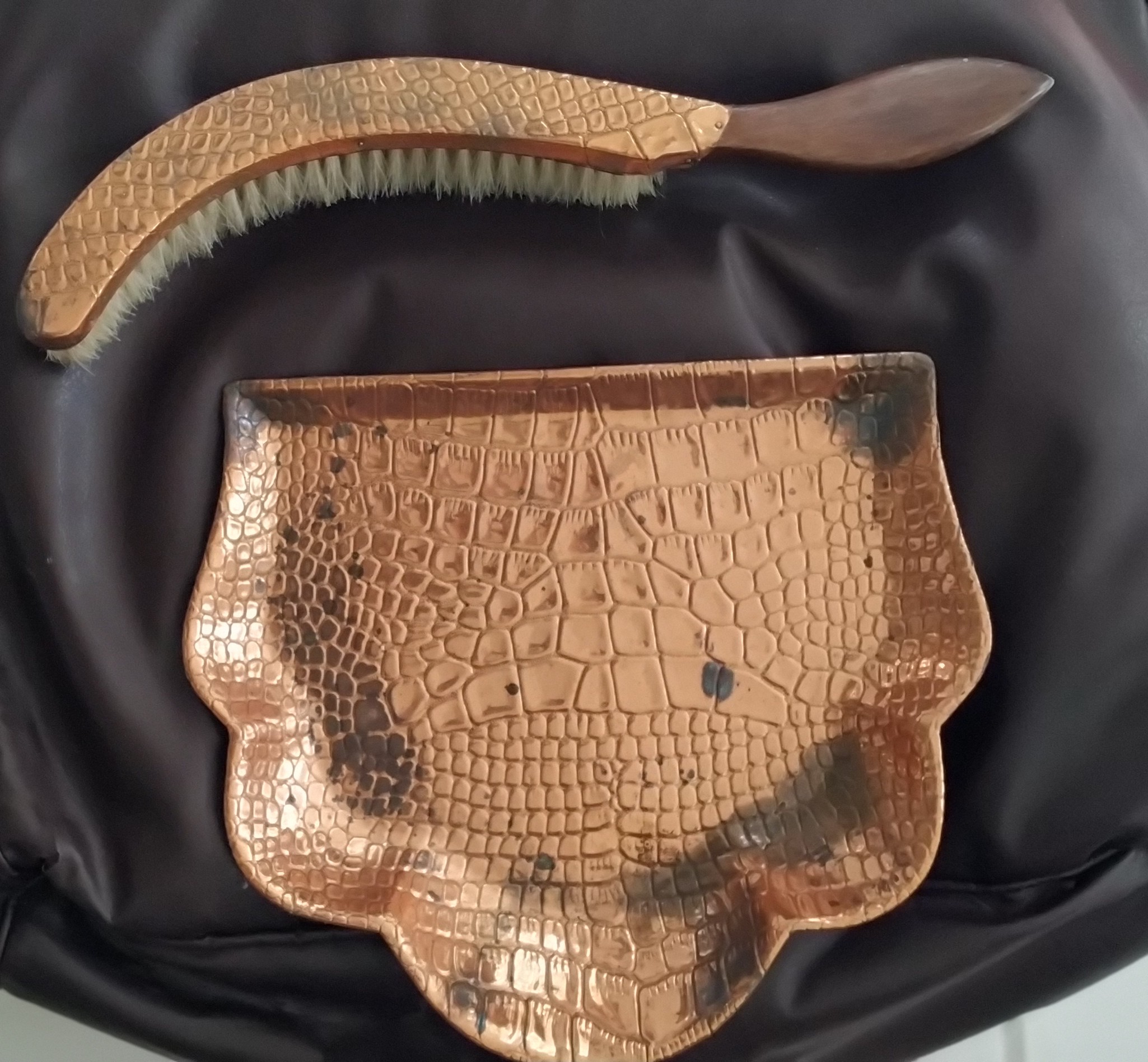 But what it brought to mind for me was this – it’s a brush and crumb tray set, like a little dustpan and brush, for sweeping crumbs off the table cloth. I have two of these, the other one is plain wood, but they both have the curved brush.