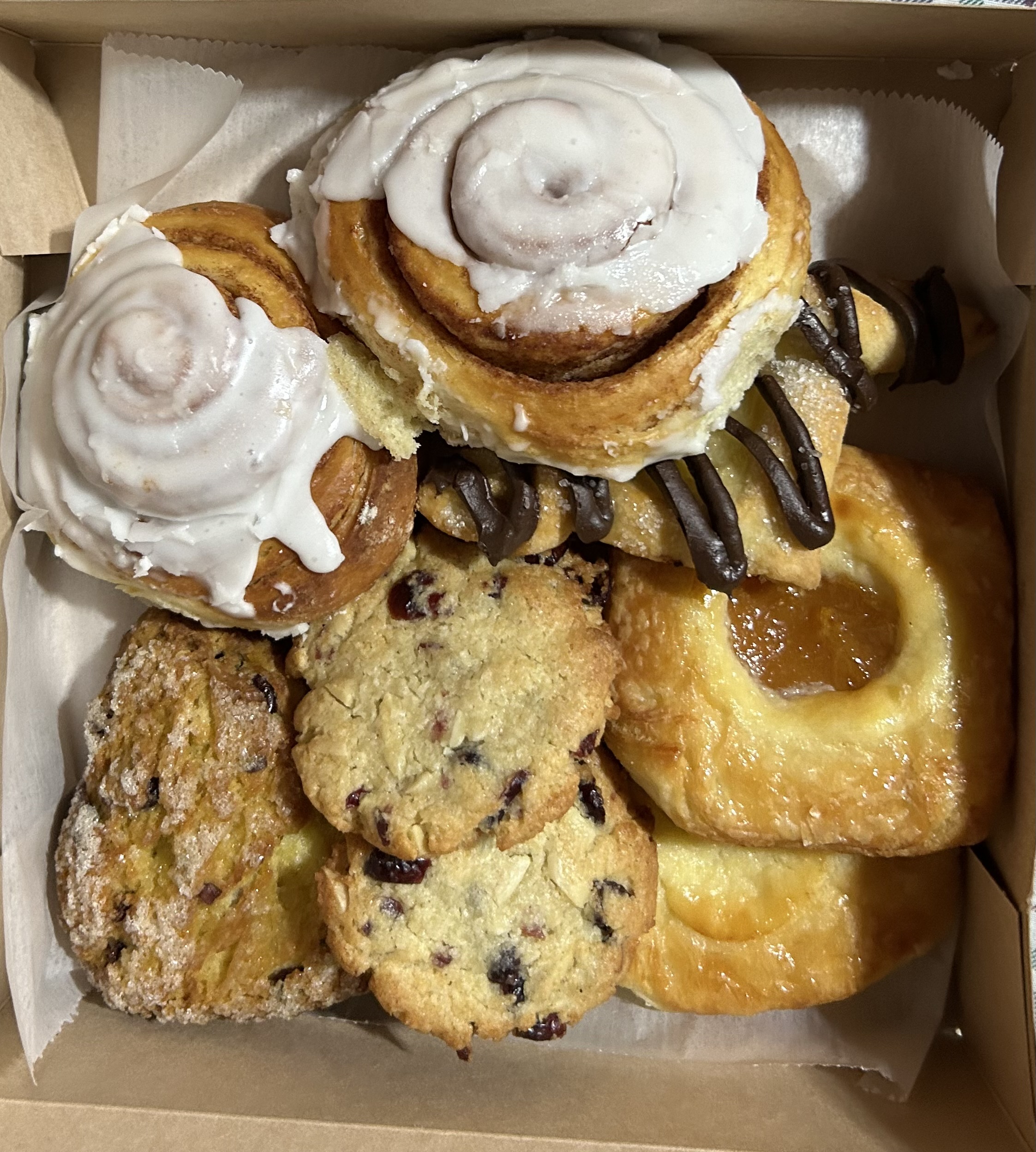 Our first morning there I received a telephone call from a friend that we’d find a surprise on our front porch. She had left a box of bakery goodies. My husband enjoyed them very much.