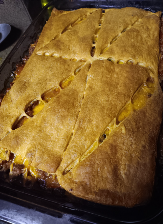 I then took some refried beans and spread it out over the crescent layer, poured in the beef mixture, topped it with a hefty helping of shredded cheese, and then put a second tube of crescent roll dough over the top.