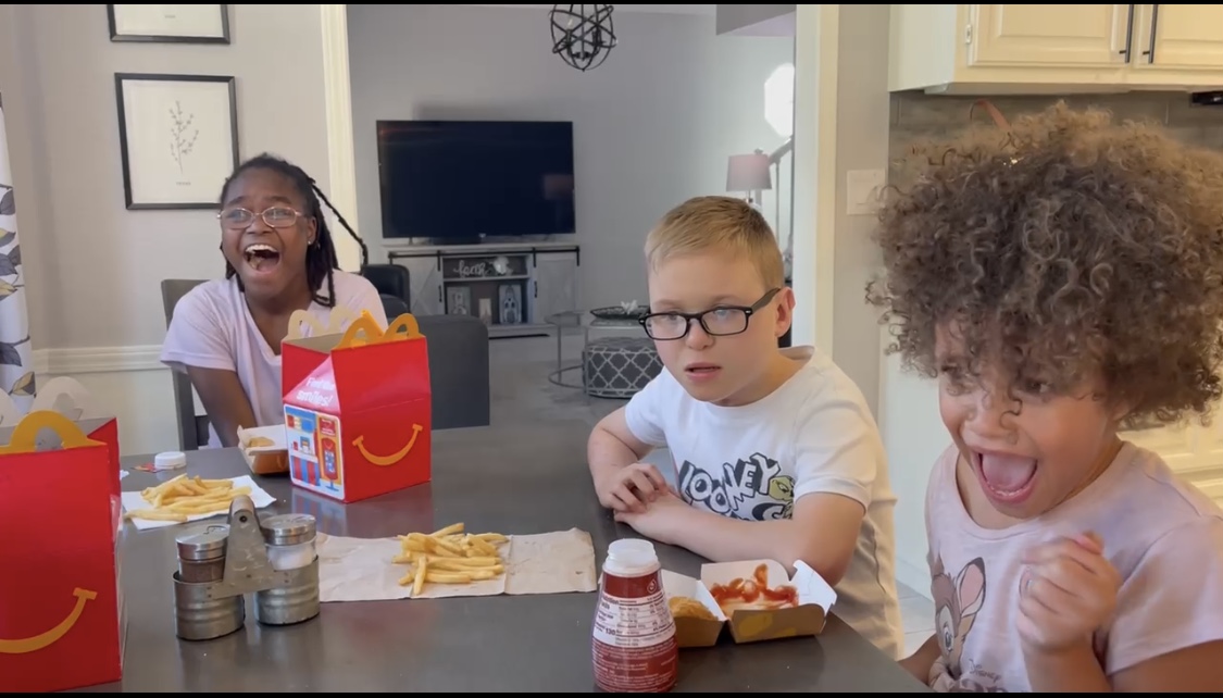 So my sister wasn’t going to tell the kids until November about going to Disneyland, but the week had gone so poorly for her and Jeff that they needed to be cheered up. So they sat the kid’s down with a Happy Meal (a rare treat), and recorded them hearing the news. This is a screenshot from their reaction. Annelyn is starting to scream a scream that hurt my head (she then goes running throughout the downstairs), Amyra is full of joy, and Hudson is trying to decipher what my sister just said over Annelyn’s scream.