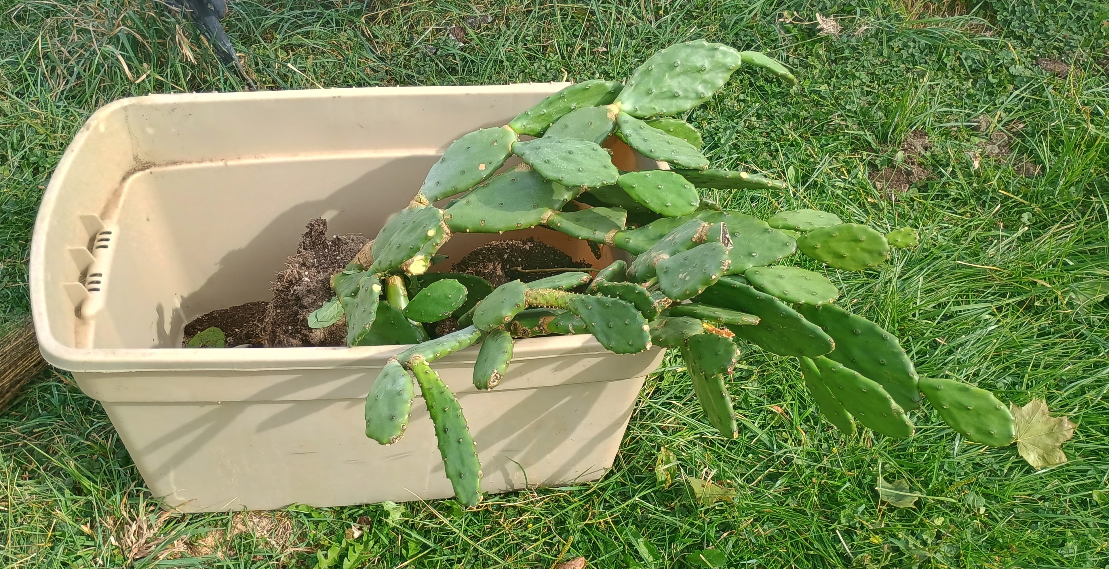 I have had these prickly pear cactus in pots. But it was getting very hard to carry them in and out of the house even with them staked up. I finally had the idea to put them in a tote. Now I can tilt it and drag. I am going to plant them next year if my starts survive. I have finally figured out where I want them.