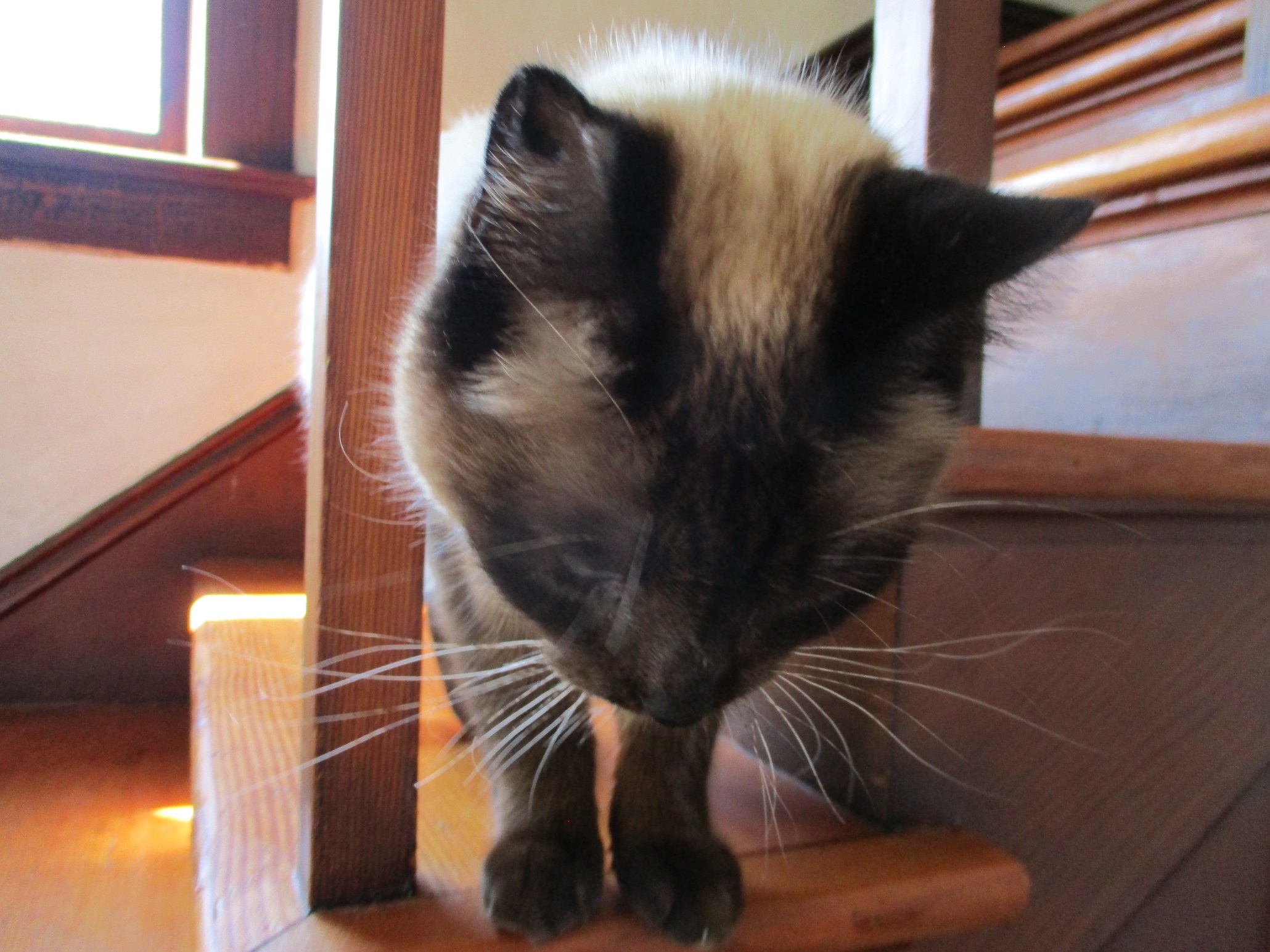 Anybody who knows me knows that somewhere near me will be a cat. That's Beau Teak standing on the staircase in my house. He looks what? Kind of picked on? Intrigued by something down below him? He is fuzzy even today though a few years older since this photo was one of several ones that I took as we were moving in. Since then Beau has developed a heart condition. That doesn't mean that he is sitting around. No way. He gets into plenty of trouble every day and he continues to have a large appetite.