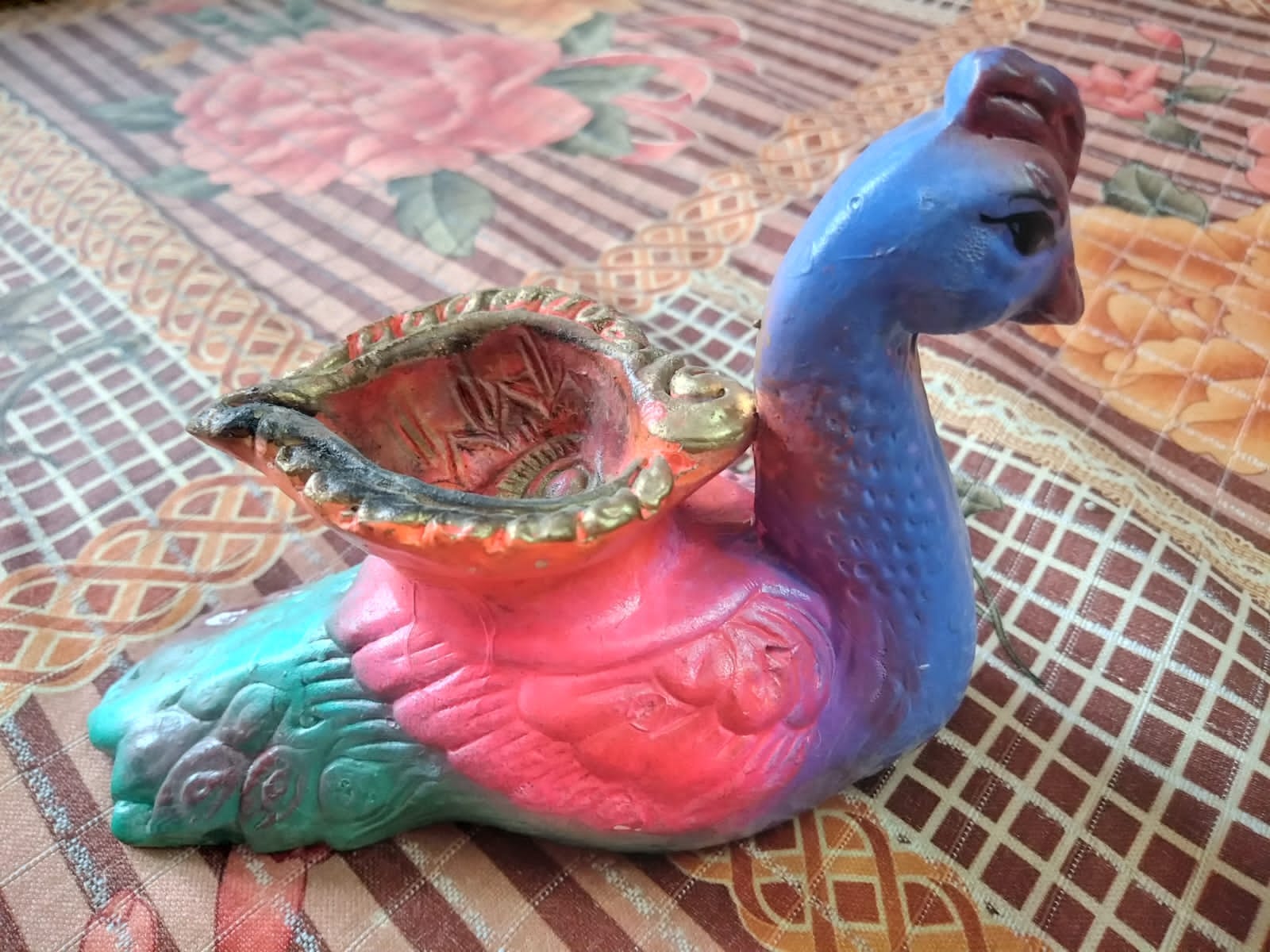 Peacock is India's national bird. The peacock diya is a mud diya created in the shape of peacock. Oil has to be added and when the cotton is ignited with match stick the diya really creates bright atmosphere.