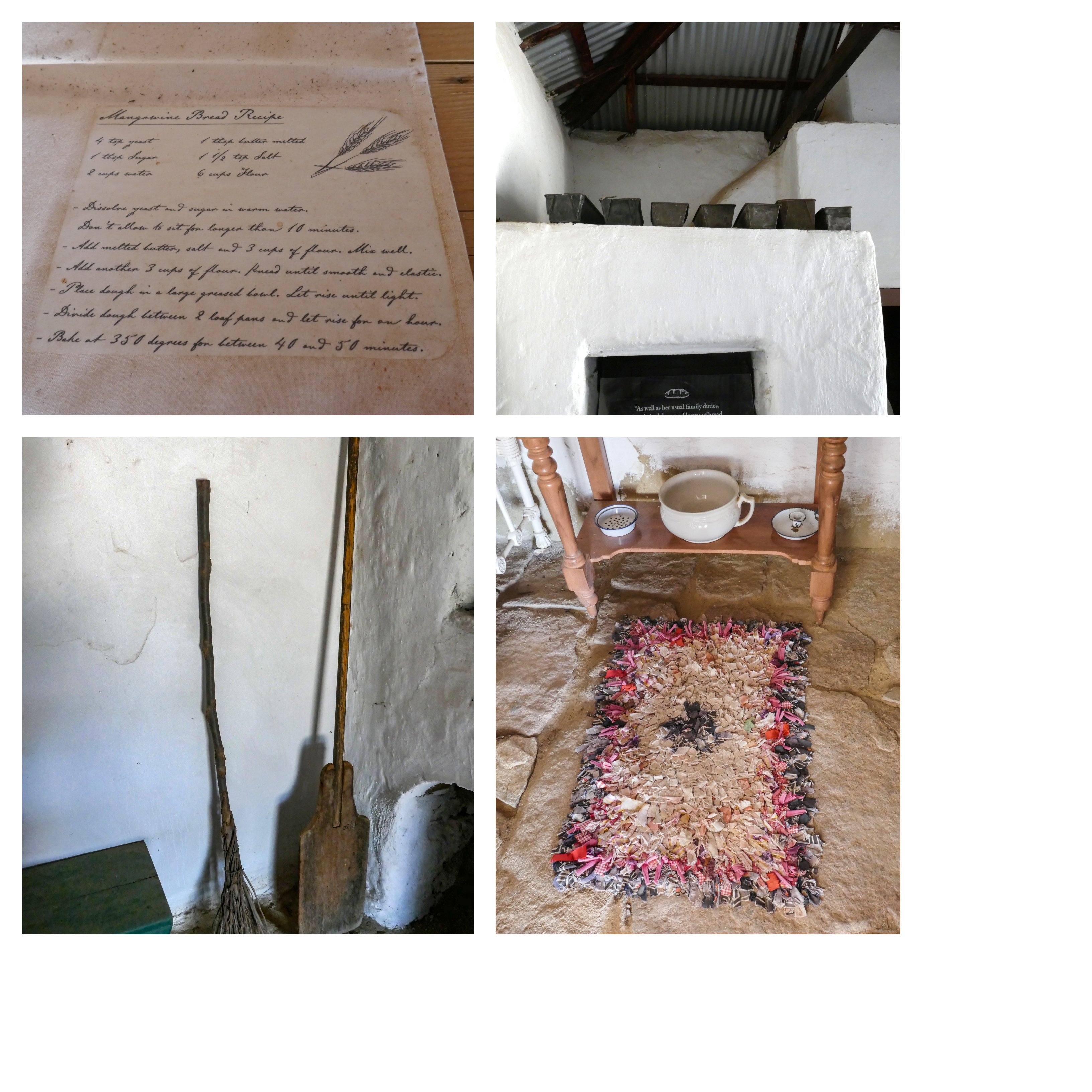Next to the recipe you can see the bread tins she used. The tins are sitting on top of the oven. Below the recipe is a bread ‘paddle’ used for sliding the baked bread out of the oven. A simple home-made broom is next to the paddle and the lower right photo shows a hand-made mat.