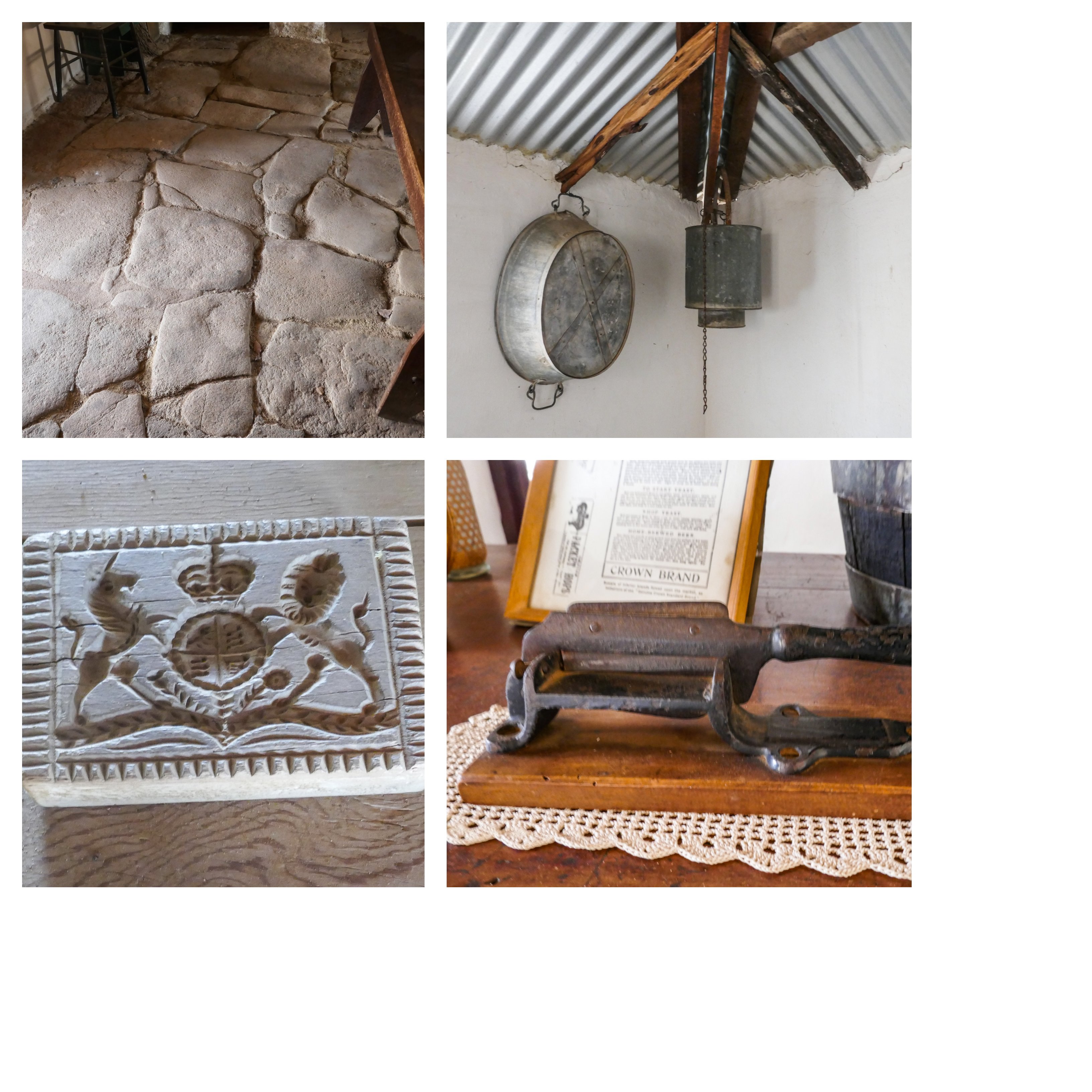 A stone floor, butter mould, tobacco cutter and shower - all from Mangowine Homestead