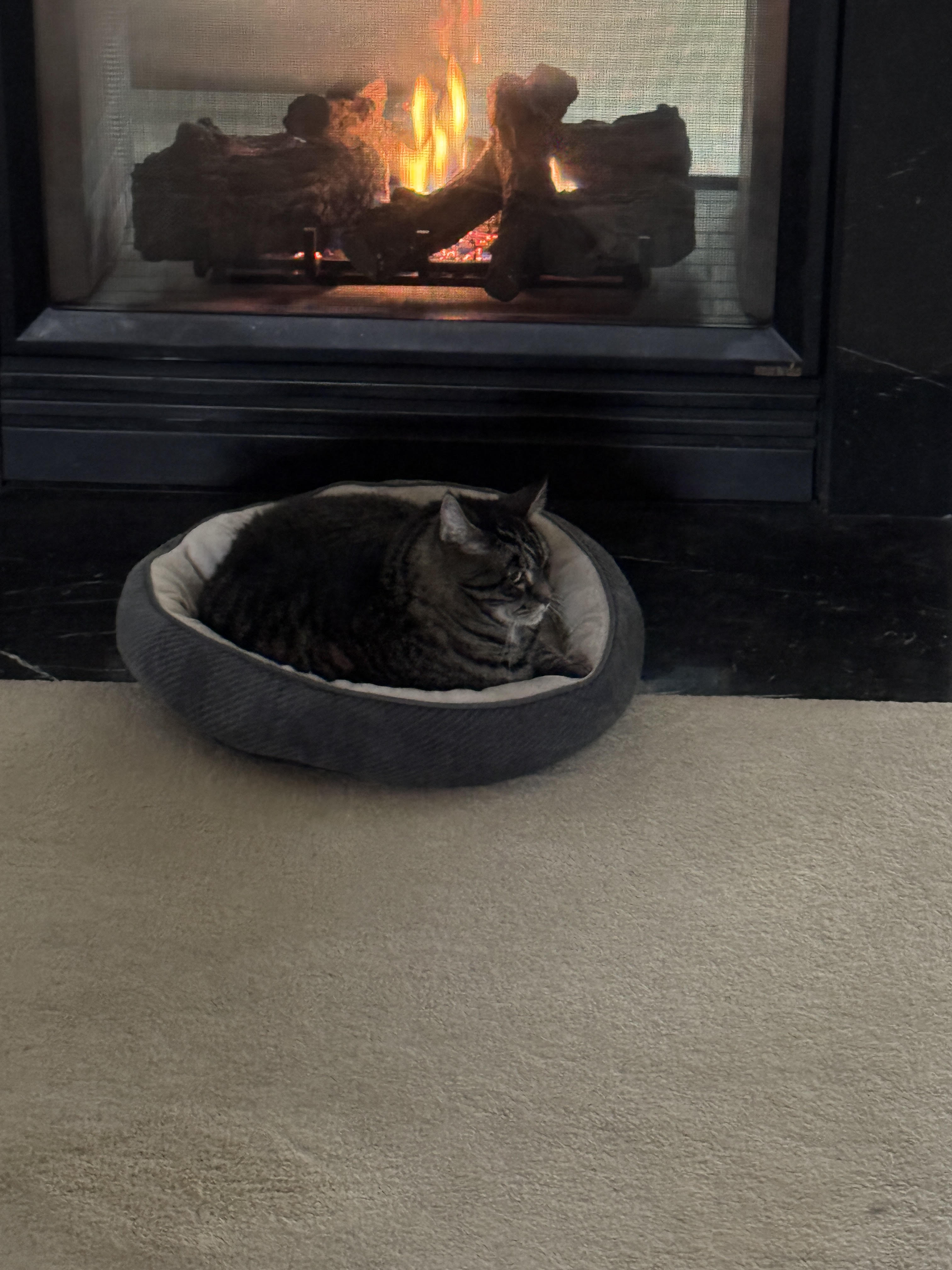 He certainly looks all comfy and cozy in front of the fireplace.