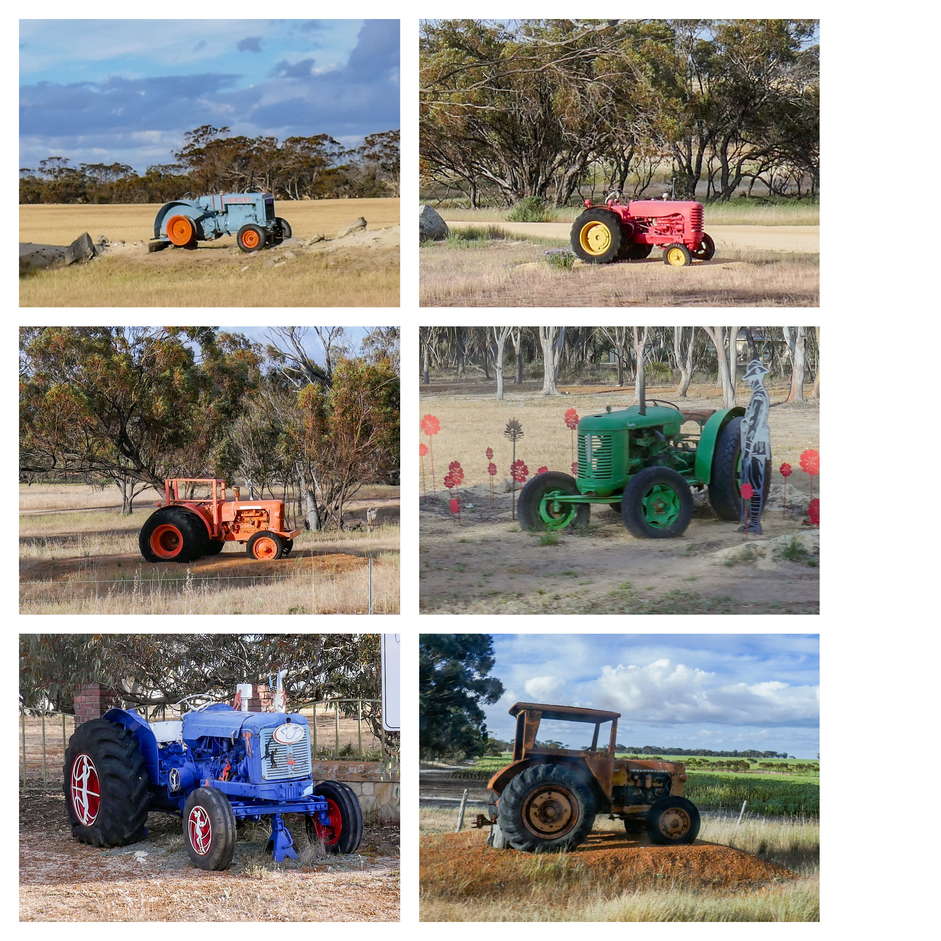 The photo shows six of the old tractors along the Horsepower Highway. We followed this highway from Broomehill to the Country Music Muster that we attended.