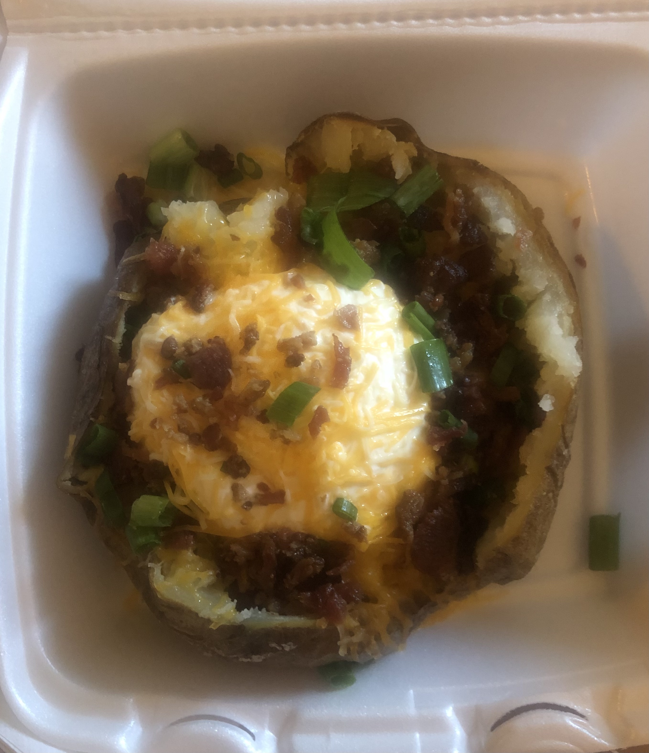 This is a picture of the huge and delicious baked potato my friend brought me the other night. It had green onions, sour cream, real bacon, and cheddar cheese on it. They have huge potatoes so it is very filling.