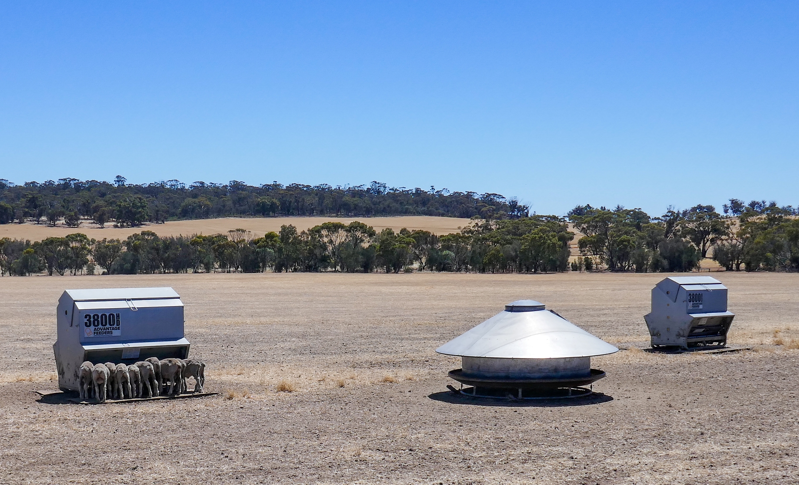 The photo shows one of the paddocks on our old farm. You can see two different types of sheep-feeders. The sheep seem to have all chosen the same feeder but It’s because they haven’t registered the sound of the ute/pickup. The sheep from the other feeders have all run off.