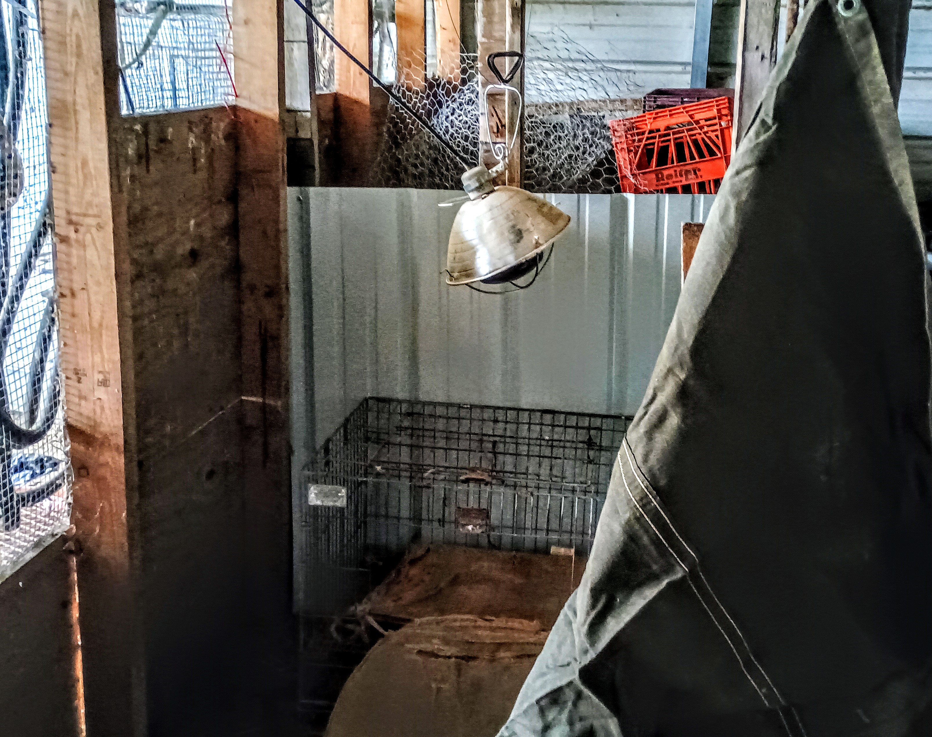 I got it fully done today. There is a tarp hanging on the right side that I can hook up to help keep the heat in from the bulb. The cage will stay open. It has a cushion they can sleep on and is extra protection if the bulb would fall. But I am sure it will not. The only thing left is running an extension cord out.