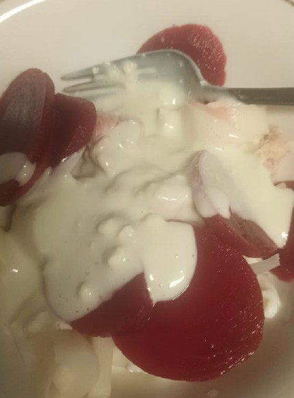 I mostly grazed yesterday morning. I grazed on another version of my default yummp salad. This time I had beets, hearts of palm, canned tuna, and a hard boiled egg, ing else, all smothered in Marie's blue cheese dressing. It was delicious. Yes,I shared each time you make them?some tuna with Kitty.