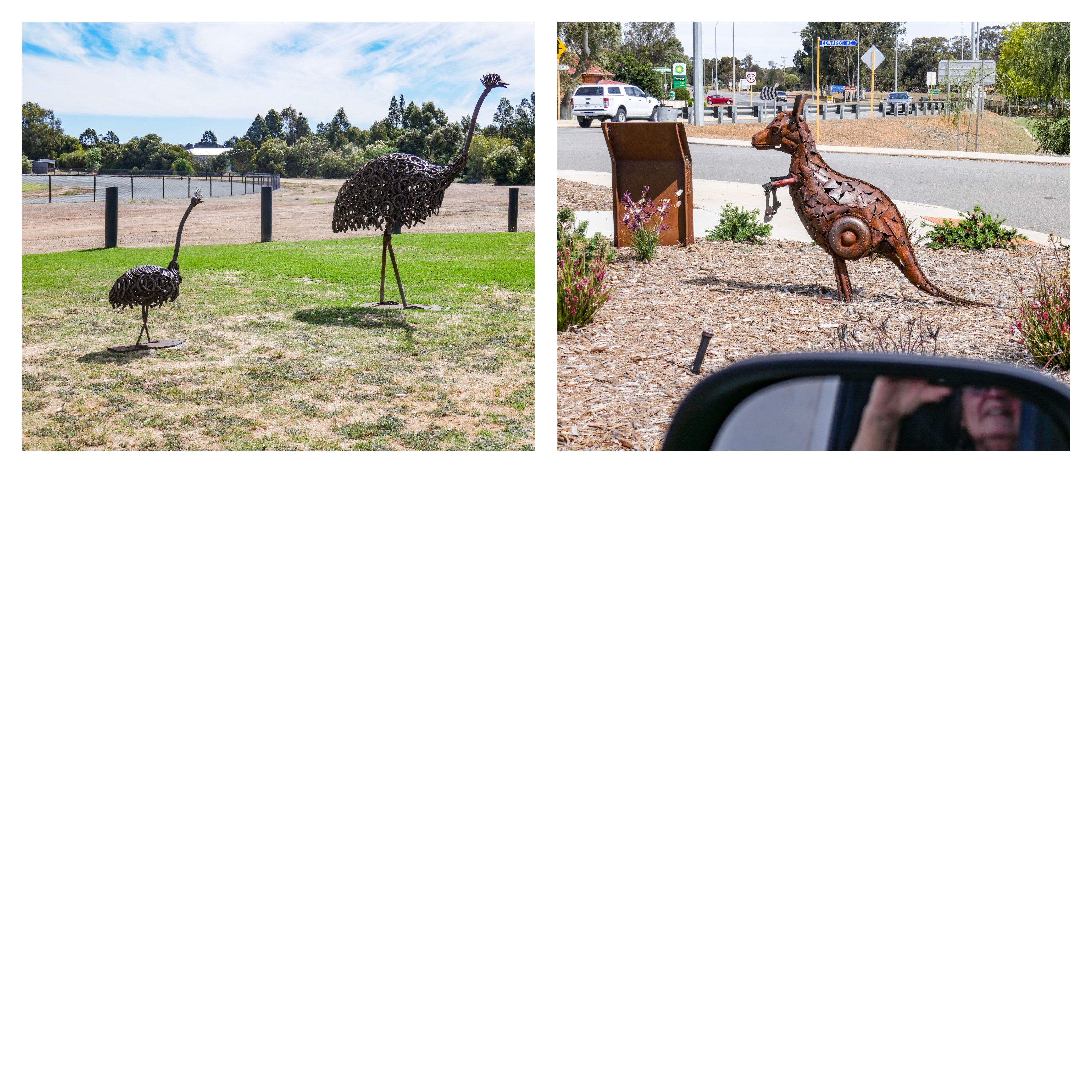 The photo shows two more sculptures we saw in Williams that were made from metal scraps and/or old tools. Some of these sculptures are better than others and while these are quite good, the kangaroo’s forepaws bend the wrong way. So the elbows should hang down by the sides then bend the other way.
