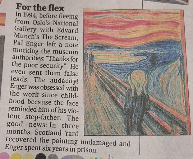 In 1994, before fleeing with Edvard Munch's "The Scream" from Oslo’s National Gallery, Enger left a mocking note for the guards: "Thanks for the poor security."