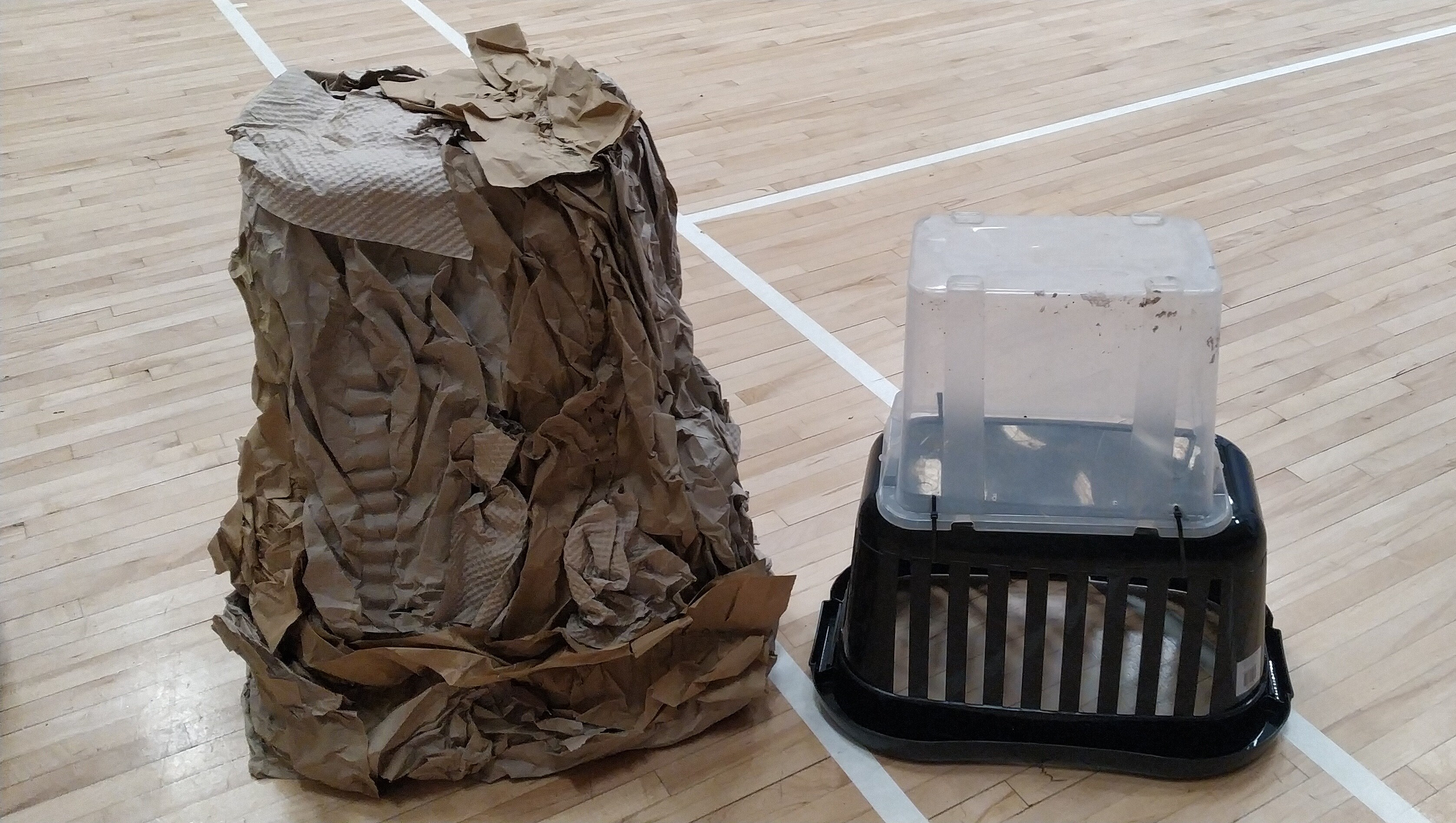 Our lead props and scenery person is very creative and full of bright ideas. She’s been making all kinds of things out of paper plates, pool noodles and wire. Meanwhile I have been gathering up old laundry baskets and brown packing paper (from Freegle and neighbours) to make ‘rocks’ that are light and easy to carry on and off stage.
