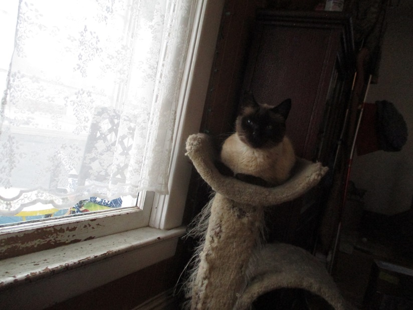 The photo should show Beau sitting on the cat seat that Fred loves to beat up.