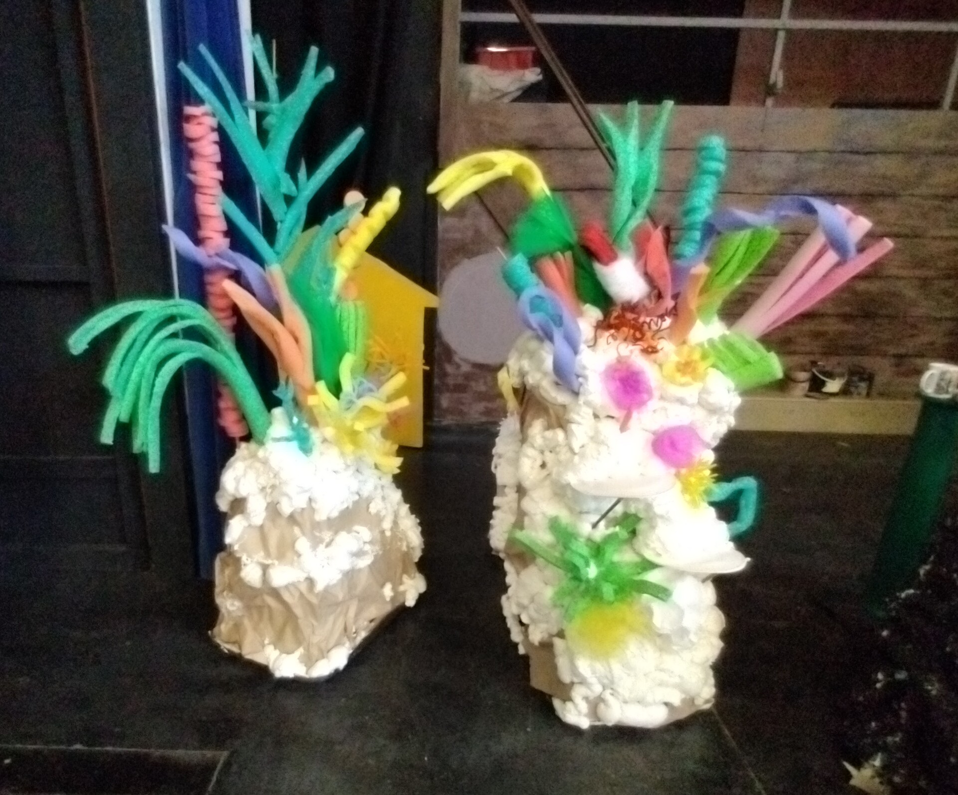 So here’s the next stage in the creation of our rocky sea-bed scenery. Carefully hand-crafted out of broken plastic laundry baskets and storage boxes, unwanted packing paper, chewed up swimming pool ‘noodles’ and offcuts of pipe insulation.