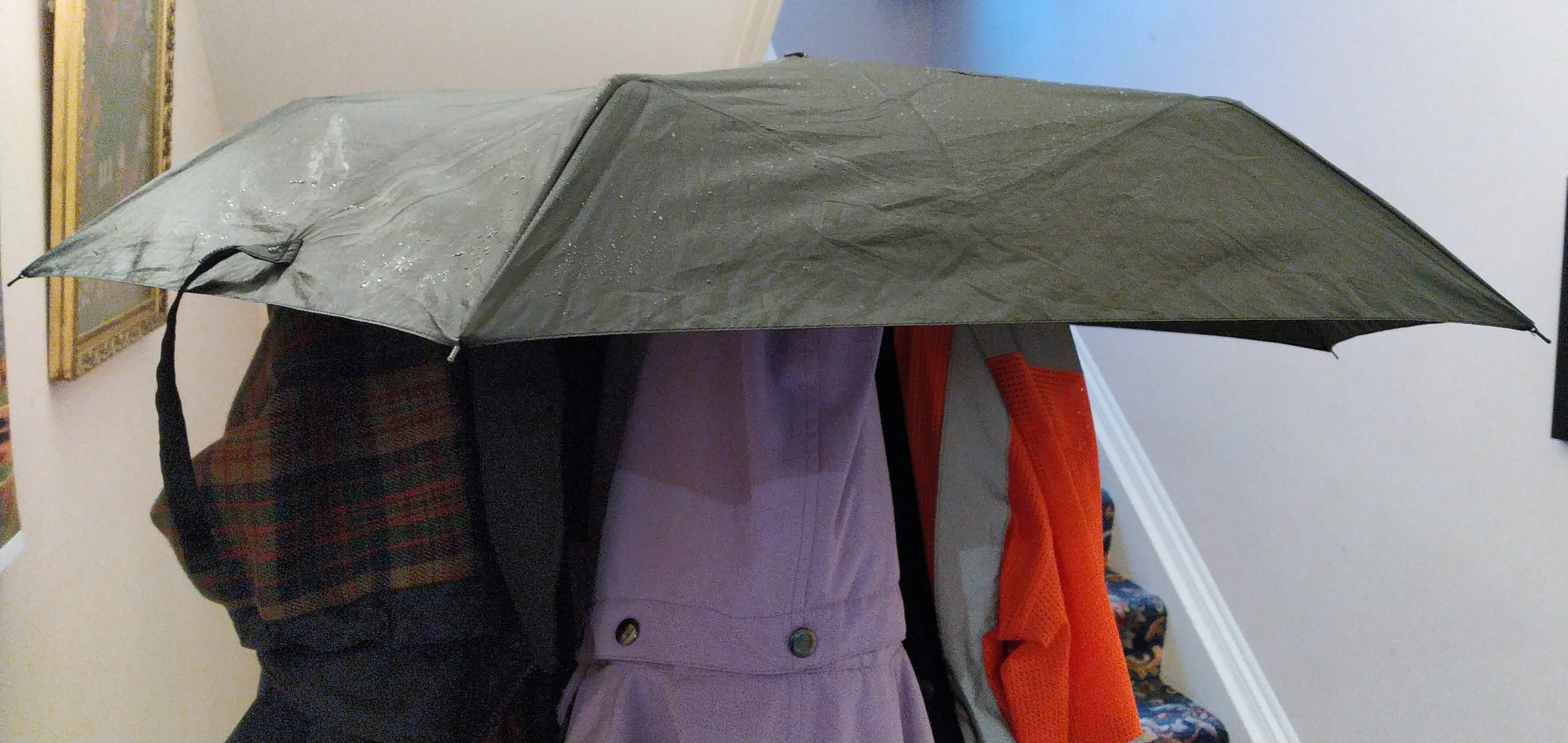 Well of course I picked it up. It’s one of those multi-folding ones that fold up small enough to fit in a bag. A couple of the flimsy struts were bent but they weren’t actually broken and the metal is so pathetic I was able to bend them back into shape. Still, better than nothing. If a visitor gets caught in a sudden downpour we will be able to give them an umbrella to get home with!