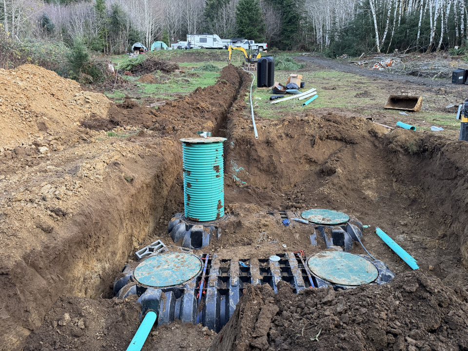 Yes! They still have some wiring to do but the septic is going full force. Since this photo, they have dug a lot out there installing the various lines and a 60 foot wide drain field. It's so interesting watching them. It's raining hard now too but they are pushing along as far as they can today.