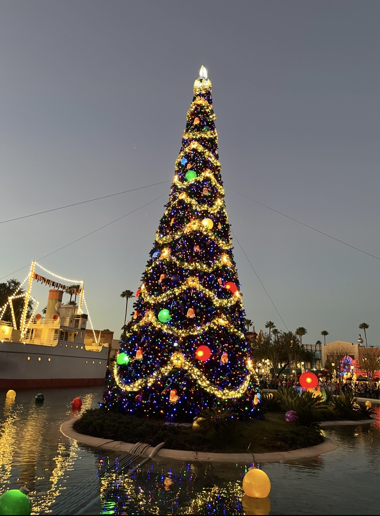 Photo is the Christmas tree at Disney's Hollywood Studious. I love that they set it up in the middle of a pond where all the lights reflect off the water.