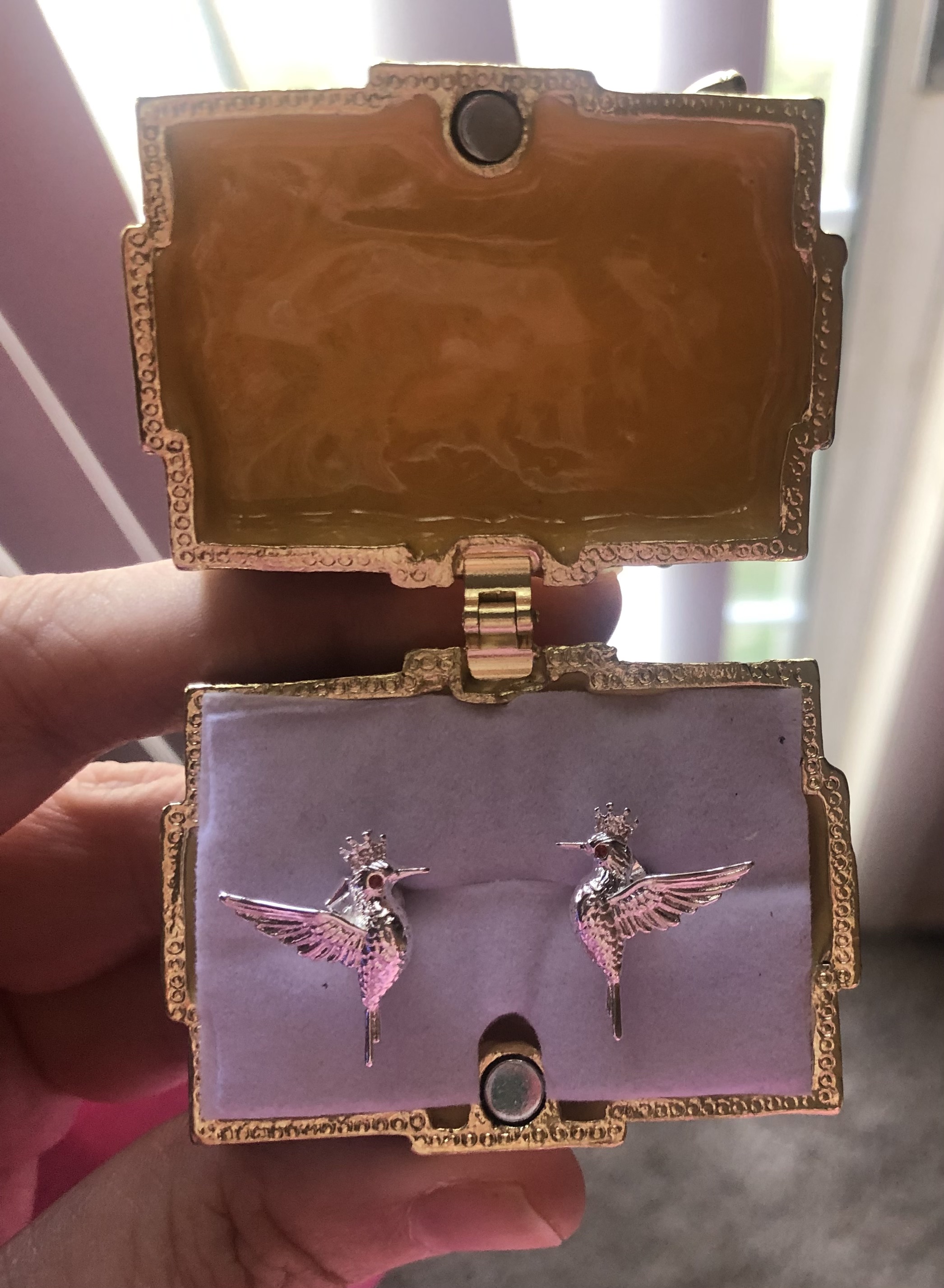 My dad’s wife loves hummingbirds, and she made her backyard a haven for birds, and especially loves the hummingbirds. This is a picture of the present I got my stepmom for Christmas, and it was fortunate I found hummingbird (with crowns) earrings I could give to her without having to pay. It felt meant to be!