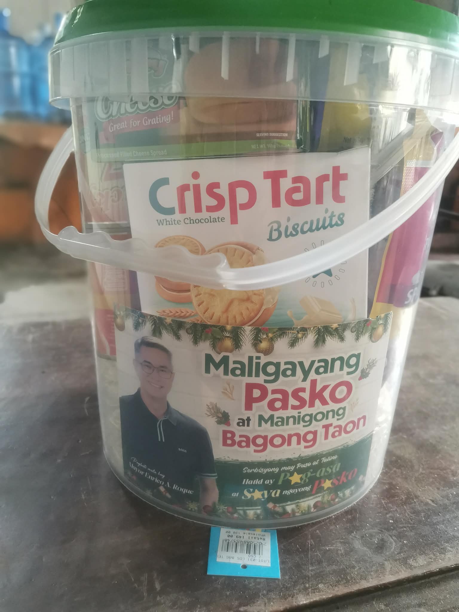 It is first time to happen in our town. First time to receive a plastic pail with loads of Christmas items. It has chips, cookies, pasta, spaghetti sauce, and canned meats and also rice.