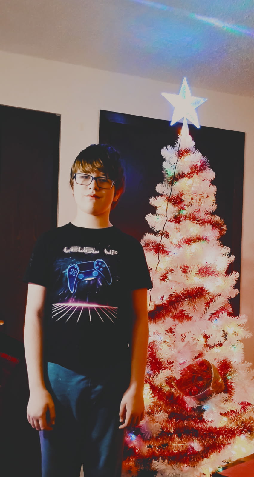 Photo is mine...Eli with our Christmas tree. He's getting so tall, the tree is 6 and a half feet - he's about 5 foot 2 I think.