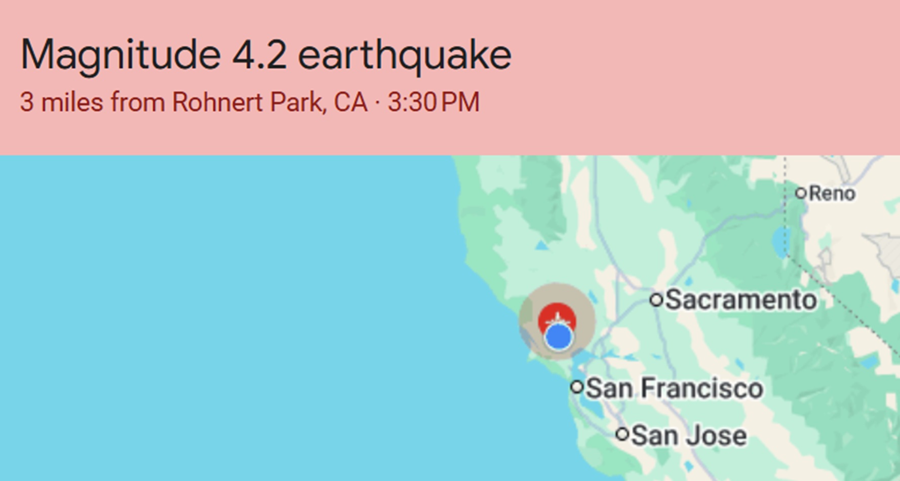 According to what I looked up, it was 4.1 on the Richter scale, and three miles outside of Rohnert Park, where my brother lives, which is 10.5 miles form where I live.