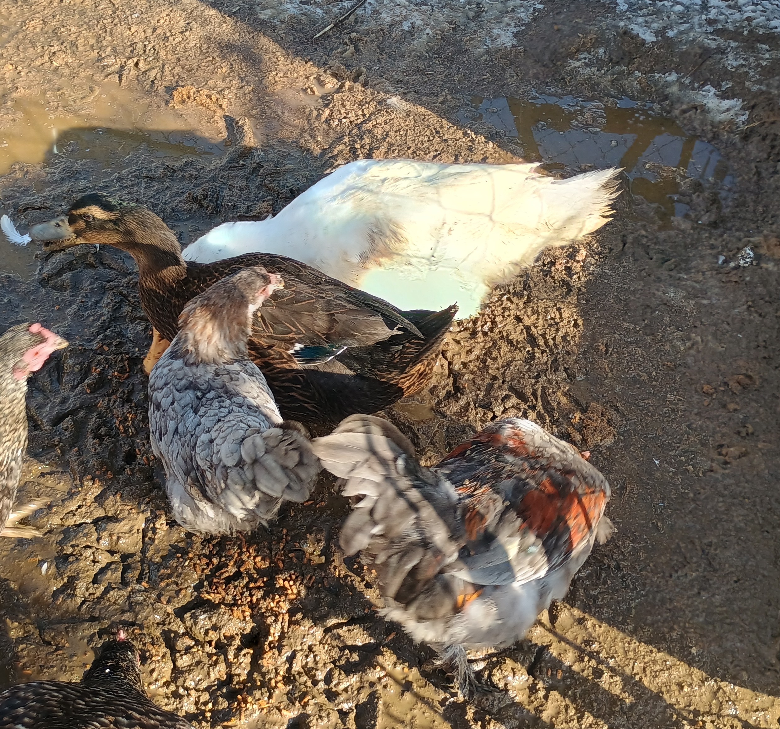 The picture is the 2 ducks. The grey one is my young hen and the multi colored one is that ornery young rooster.