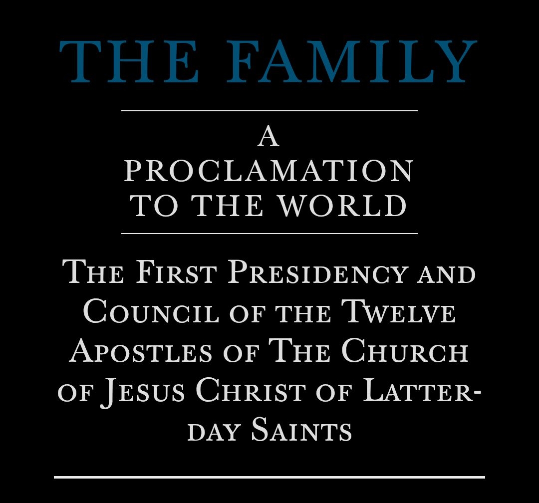 The proclamation states, "marriage between a man and a woman is ordained of God and that the family is central to the Creator’s plan for the eternal destiny of His children."