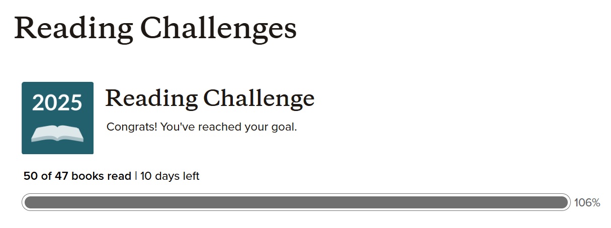 I finished the last book of the 2025 for the Amazon GoodReads challenge.