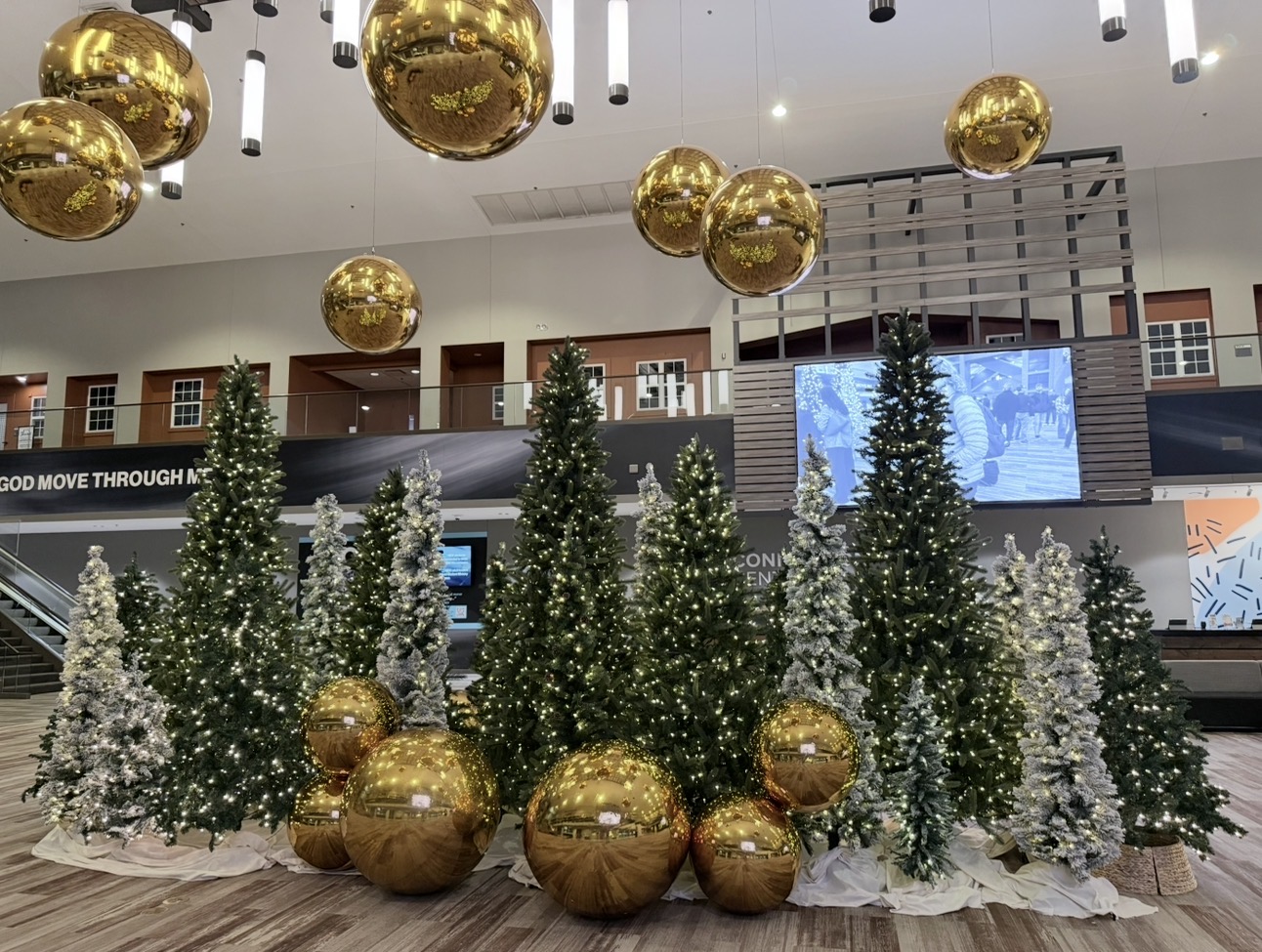 Normally there’s a focal point huge green decorated tree with little trees on each side. This year they added huge b ornaments and more trees