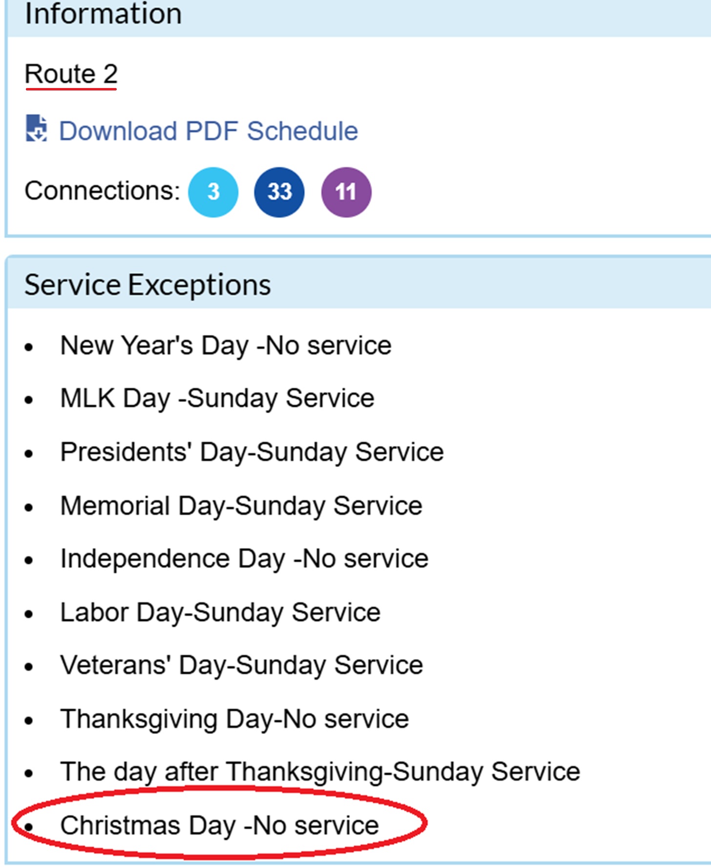 I looked on the Transit website to see what time the bus might be there, as they were on a Sunday schedule yesterday, and of course, looking at the list of days the bus doesn't run, I saw that they do not run on Christmas Day. Duh.