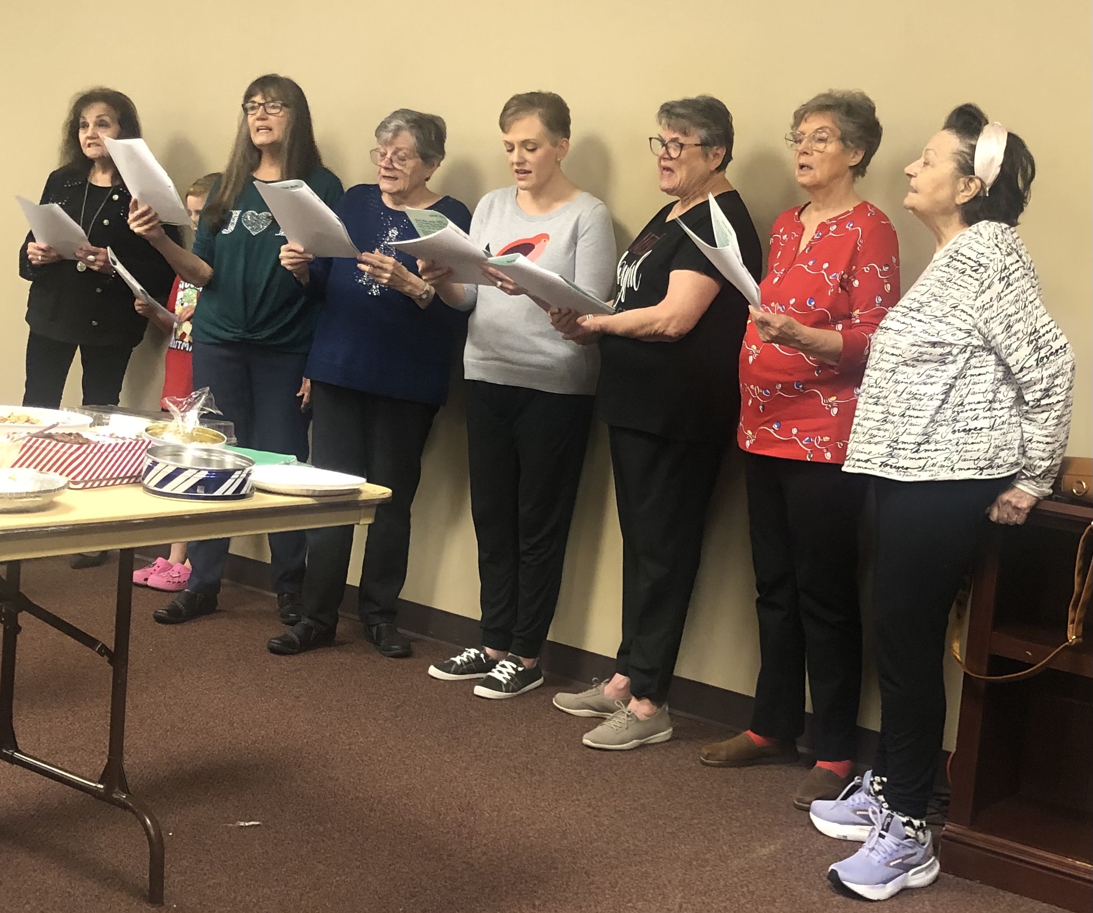 Some people go caroling, some people go to church, and some people sing along on the radio. Did you see any Christmas songs this year? This picture is of my six aunts (ages 72 through 88) and sister (obviously in the middle) at our Christmas leading the Christmas carols to sing with the family (O, Come All Ye Faithful, Go Tell it on the Mountain, Away in a Manger, Silver Bells, We Wish You a Merry Christmas). My aunts like doing this, and we all follow my aunts lead in everything. Bless my sister’s heart, I know she didn’t want to get up there, but she was a good sport, and started everyone off (my sister and BIL have great voices, and my BIL sung in a group professionally and toured Europe).