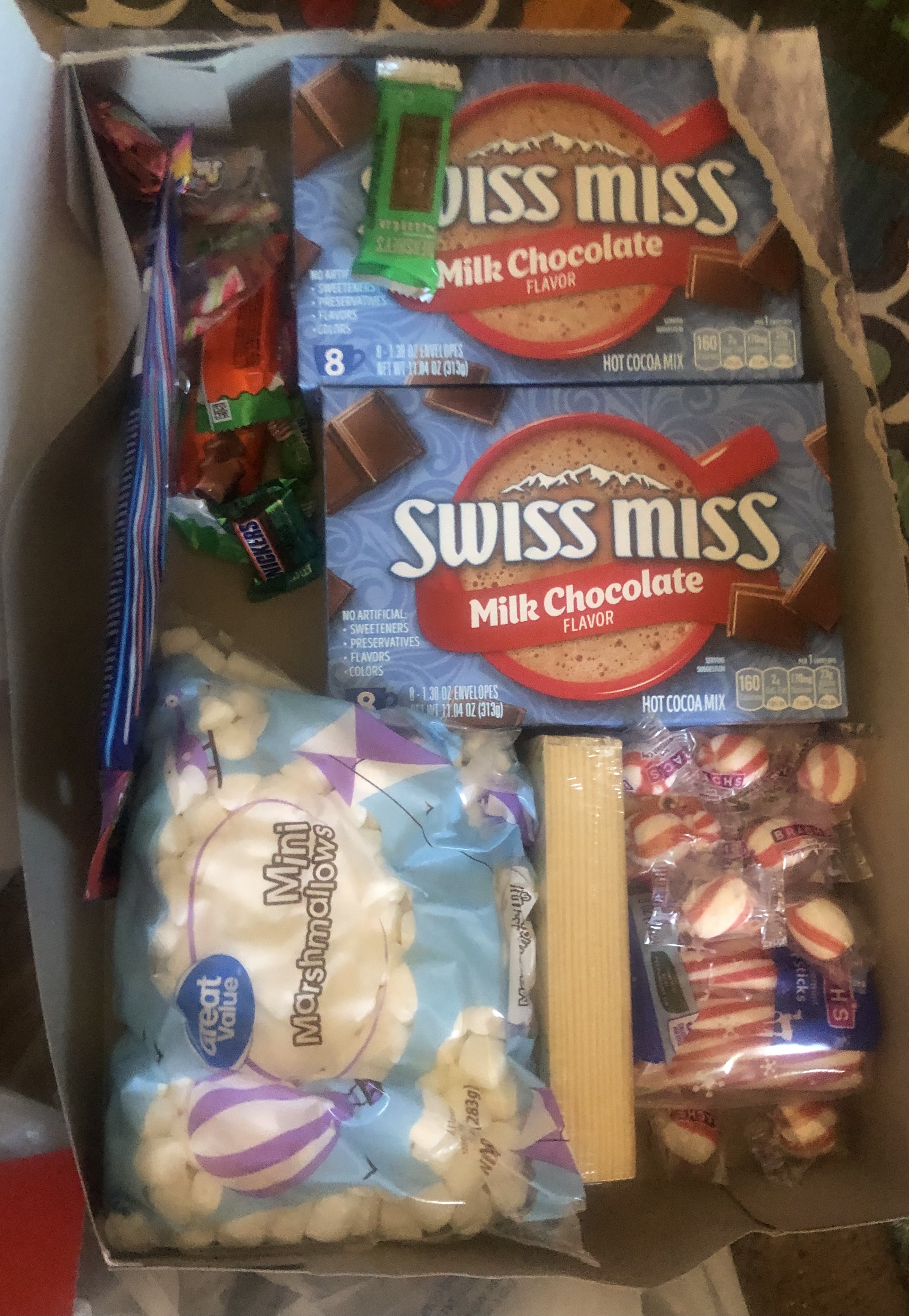 I was sitting on my couch when a friendly knock sounded on my door (yes, a knock can be friendly). I thought it was my dad because it was a playful knock. Instead, it was two teen boys from that church that brings by sack lunches to my low income apartment complex a couple of times in the summer and a couple of times in the winter. They gave me a sack lunch, and then told me they had a Christmas present for me. Behind me were bags filled with presents: a wrapped box of toys for each resident, a popcorn tin for each resident, and what you see in the picture (everything you need to make hot chocolate awesome). I almost cried. I thanked them, and they said they were just trying to show the love of The Holy Spirit.