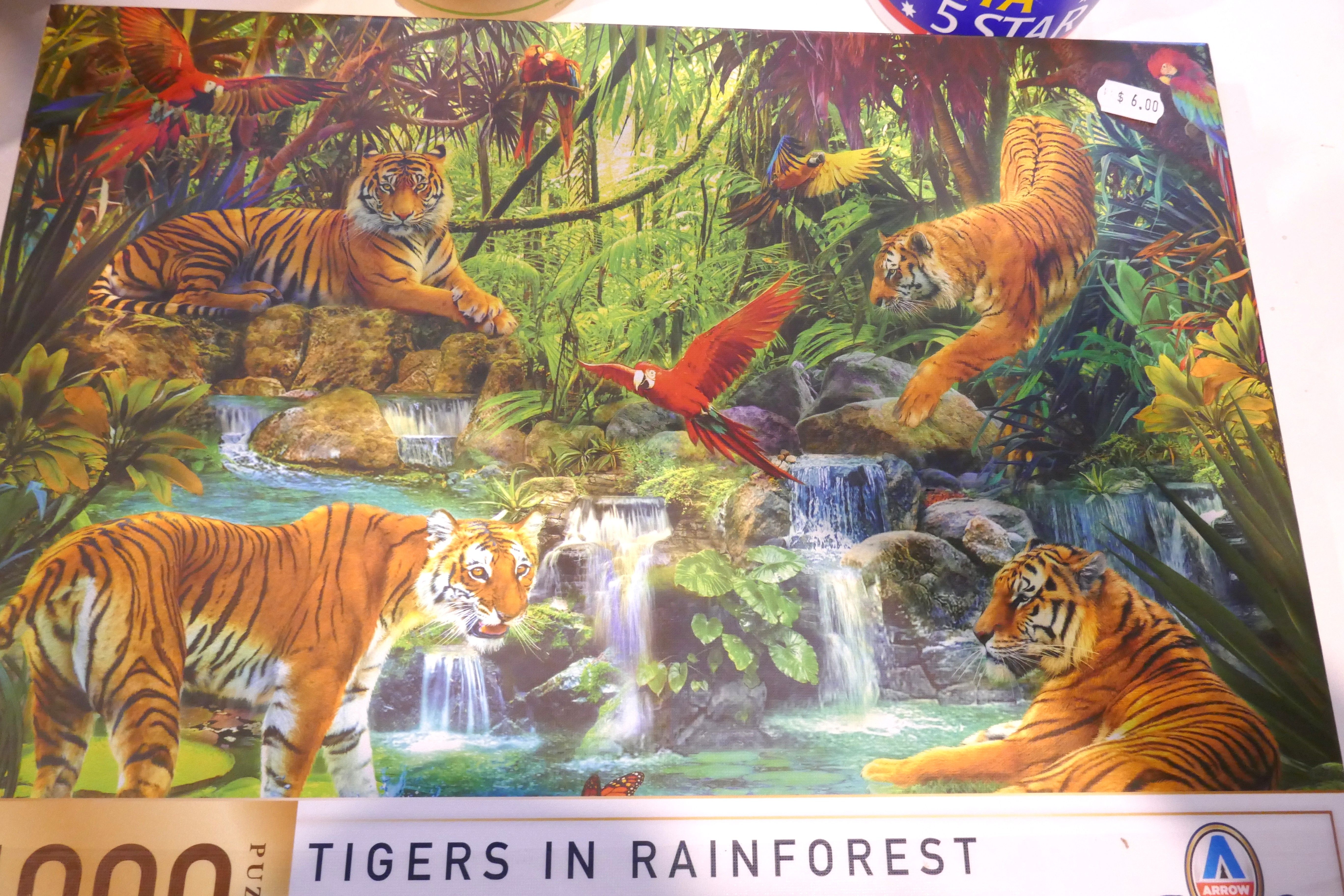 In the photo you can see another jigsaw that I bought at an op shop (thrift store). This might be a challenge too with multiple tigers, water, rocks, etc but I’m hoping it might be a bit easier than the last one.