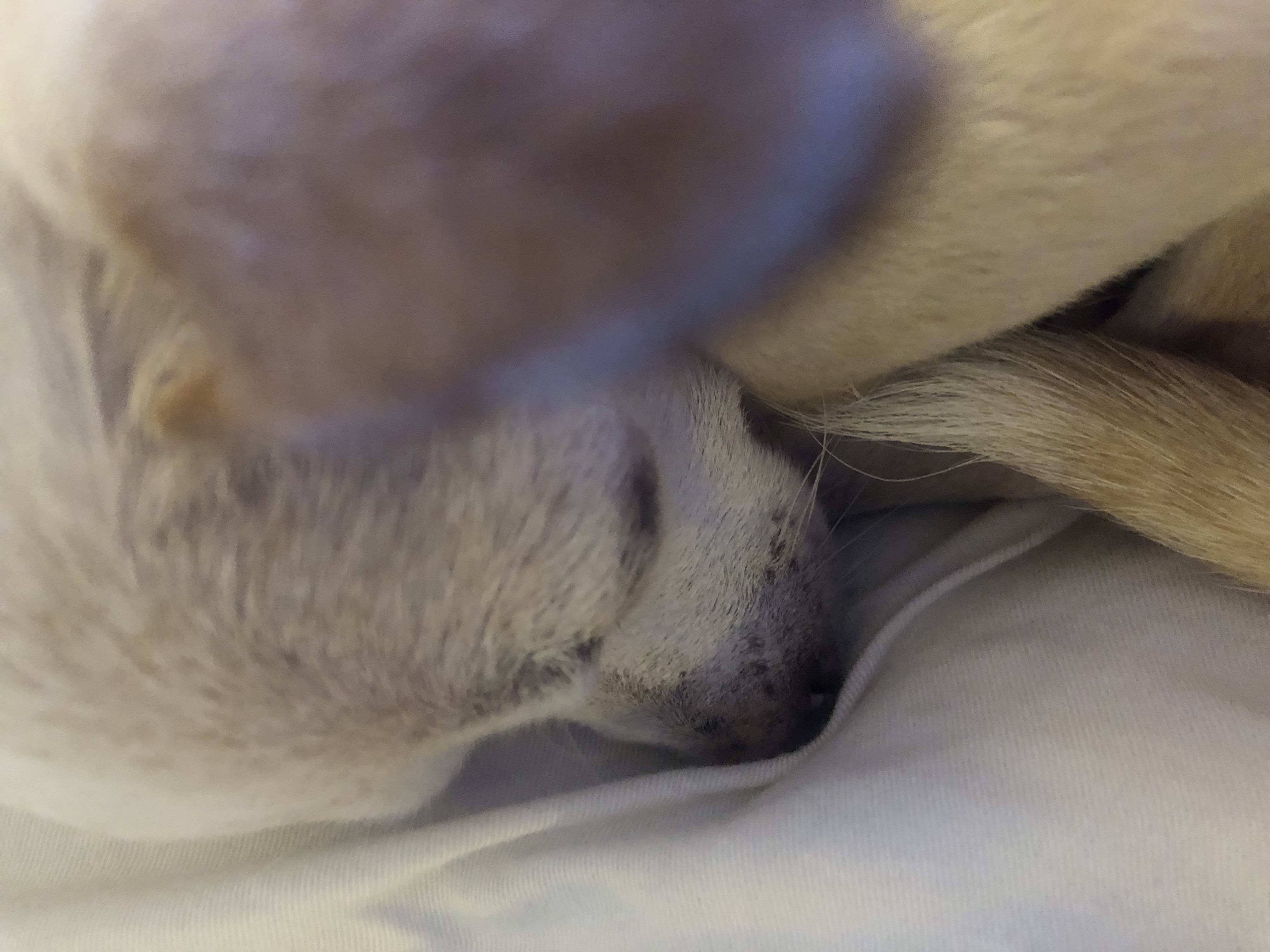 My mattress is shot so I’ve slept on my couch for years now. My couch that was messed up, but comfy, was, as you know, thrown away while I was at Disneyland. It was wider, so my dog could curl up by my side. The better couch I have now, that was my dad and stepmom’s, is not as wide, so Sadie had to sleep between my feet. She does not like that as much.