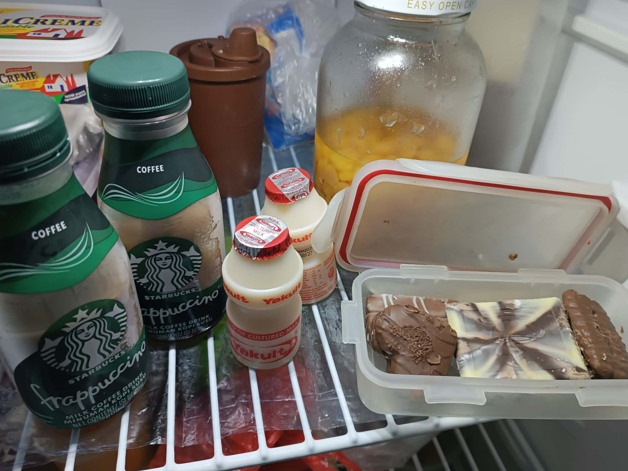 Sorry for the messy fridge. But I just want to show you some of the gifts I received that I really love, the Starbucks Coffee, and the chocolate cookies. The two Yakult is a gift that my sister received. And I got a red envelope and a pair of shoes.