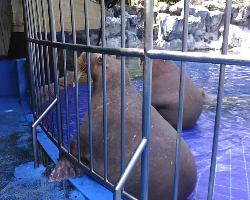 In Safari World in Bangkok in Thailand, there are different animals. The walruses are provided with fish and they have them while they are in water habitat.